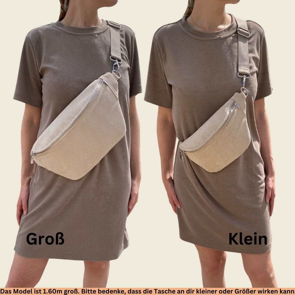 Unsere Bauchtasche aus Cord ist in zwei verschiedenen Größe erhältlich.
