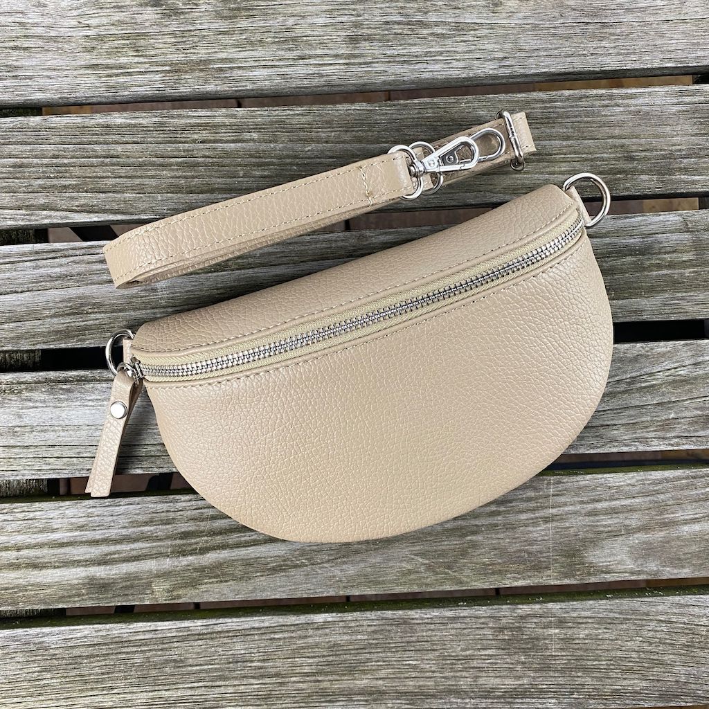 Die Bauchtasche hat silberne Reißverschlüsse und Karabiner.
