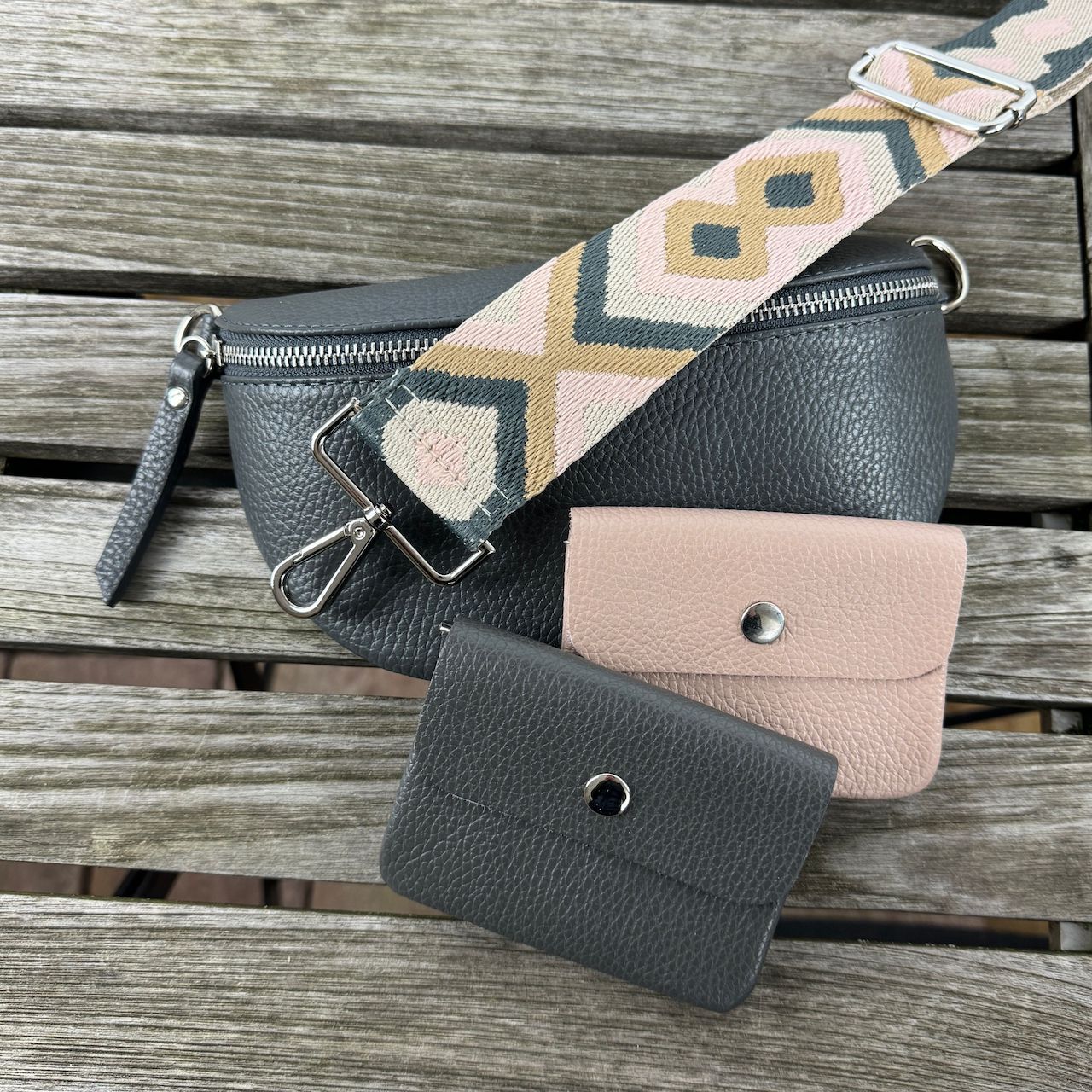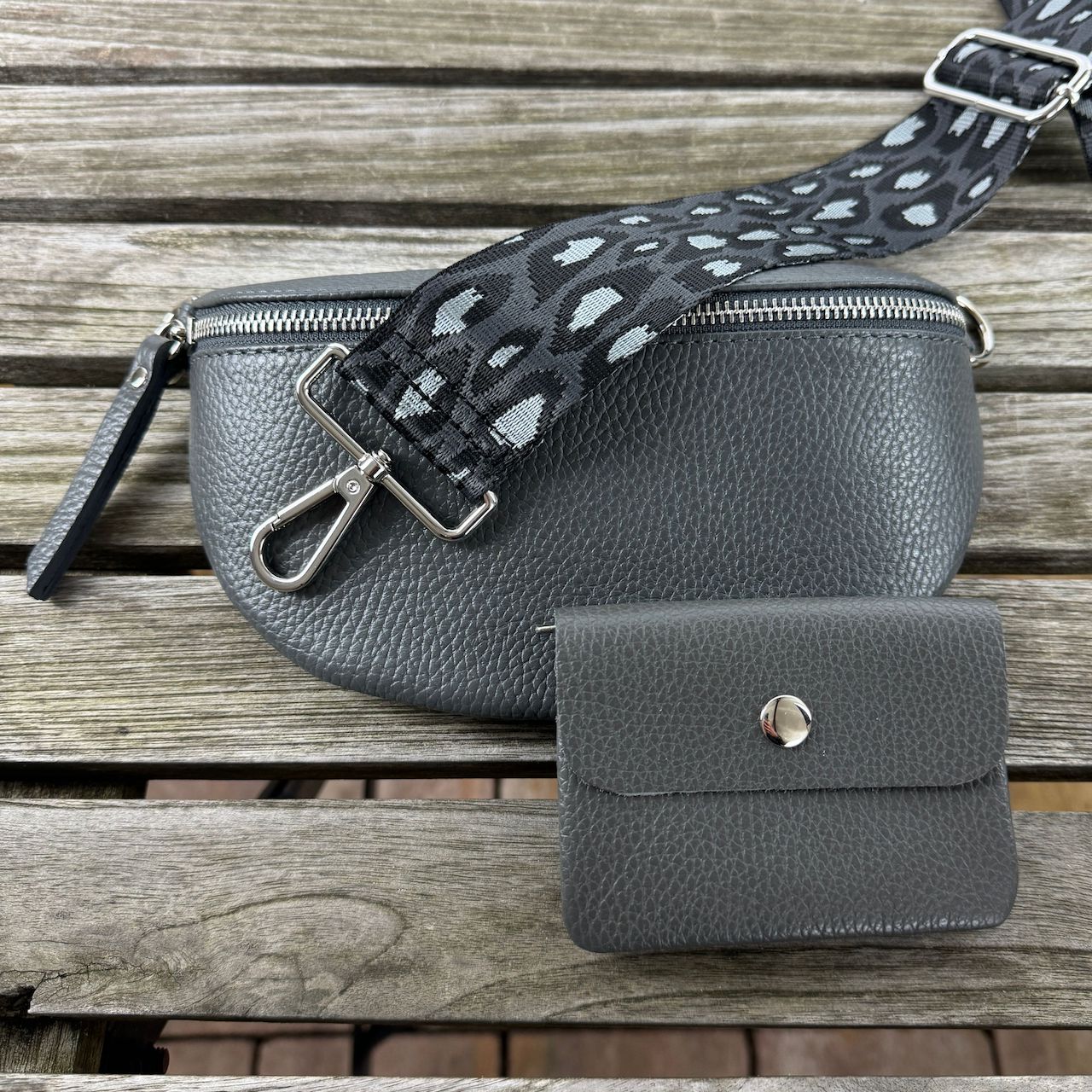 Im Lieferumfang enthalten ist eine dunkelgraue Bauchtasche aus Leder mit einem schmalen Ledergurt, sowie einem farblich abgestimmten breiten Gurt nach Wahl.