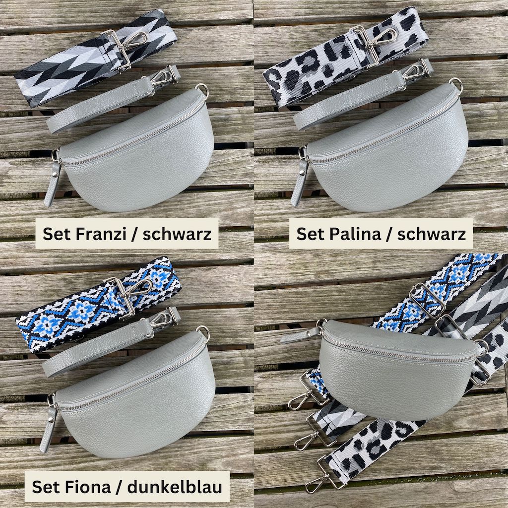 Im Lieferumfang enthalten ist eine hellgraue Bauchtasche aus Leder mit einem schmalen Ledergurt, sowie einem farblich abgestimmten breiten Gurt nach Wahl.