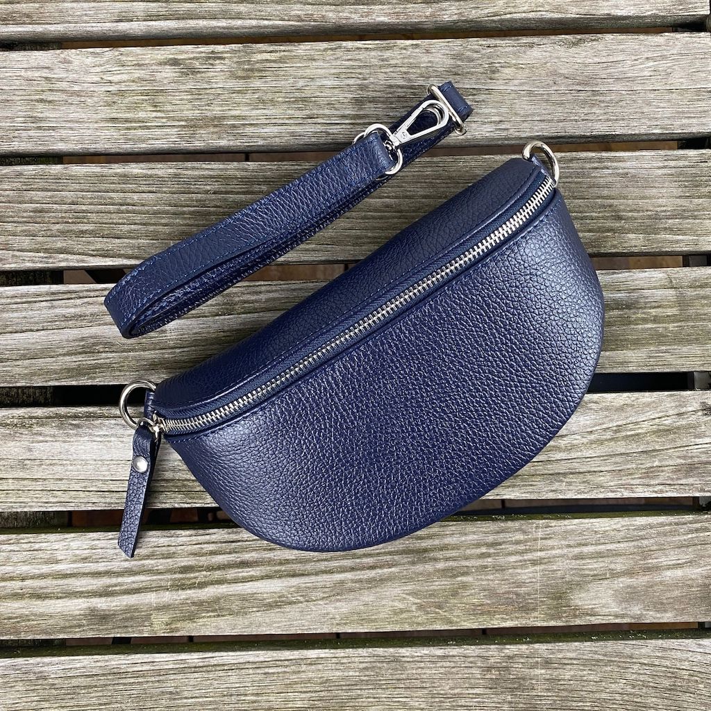 Im Lieferumfang enthalten ist eine dunkelblaue Bauchtasche aus Leder mit einem schmalen Ledergurt.