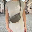 Im Lieferumfang enthalten ist eine dunkeltaupe Bauchtasche aus Leder mit einem schmalen Ledergurt.