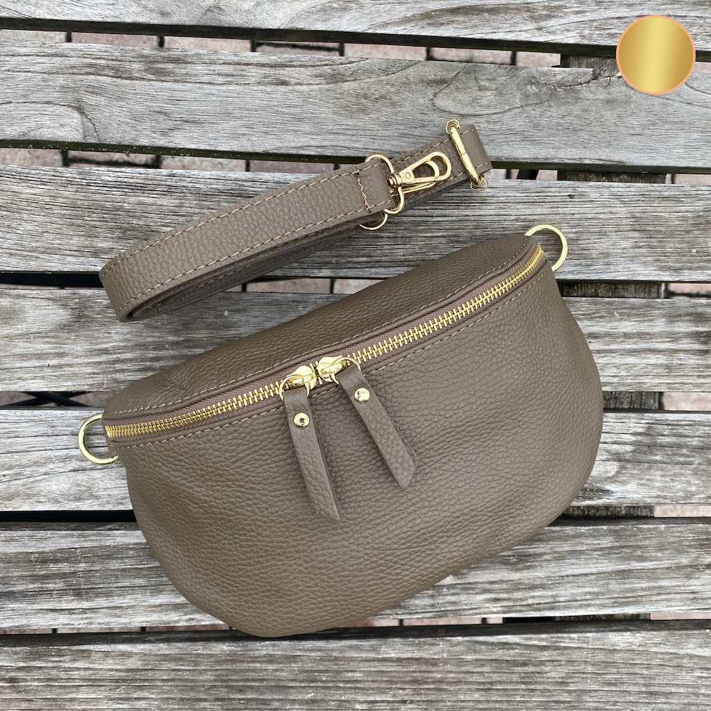 Im Lieferumfang enthalten ist unsere dunkeltaupe Bauchtasche aus Leder mit einem Ledergurt mit goldenen Verschlüssen. Der schmale Taschengurt ist in der Länge verstellbar.