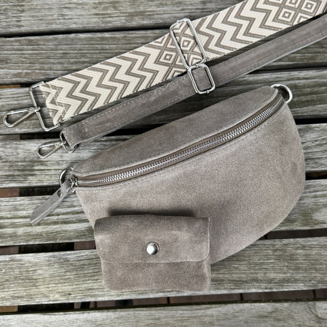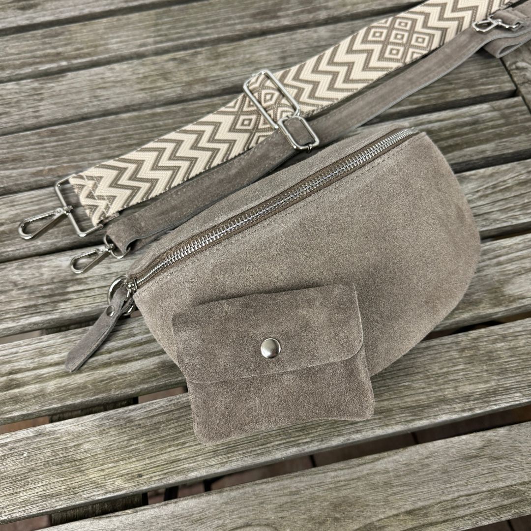 1x mittelgroße Bauchtasche aus Wildleder mit schmalem Ledergurt / Dunkeltaupe (mit innenliegendem Reißverschlussfach)