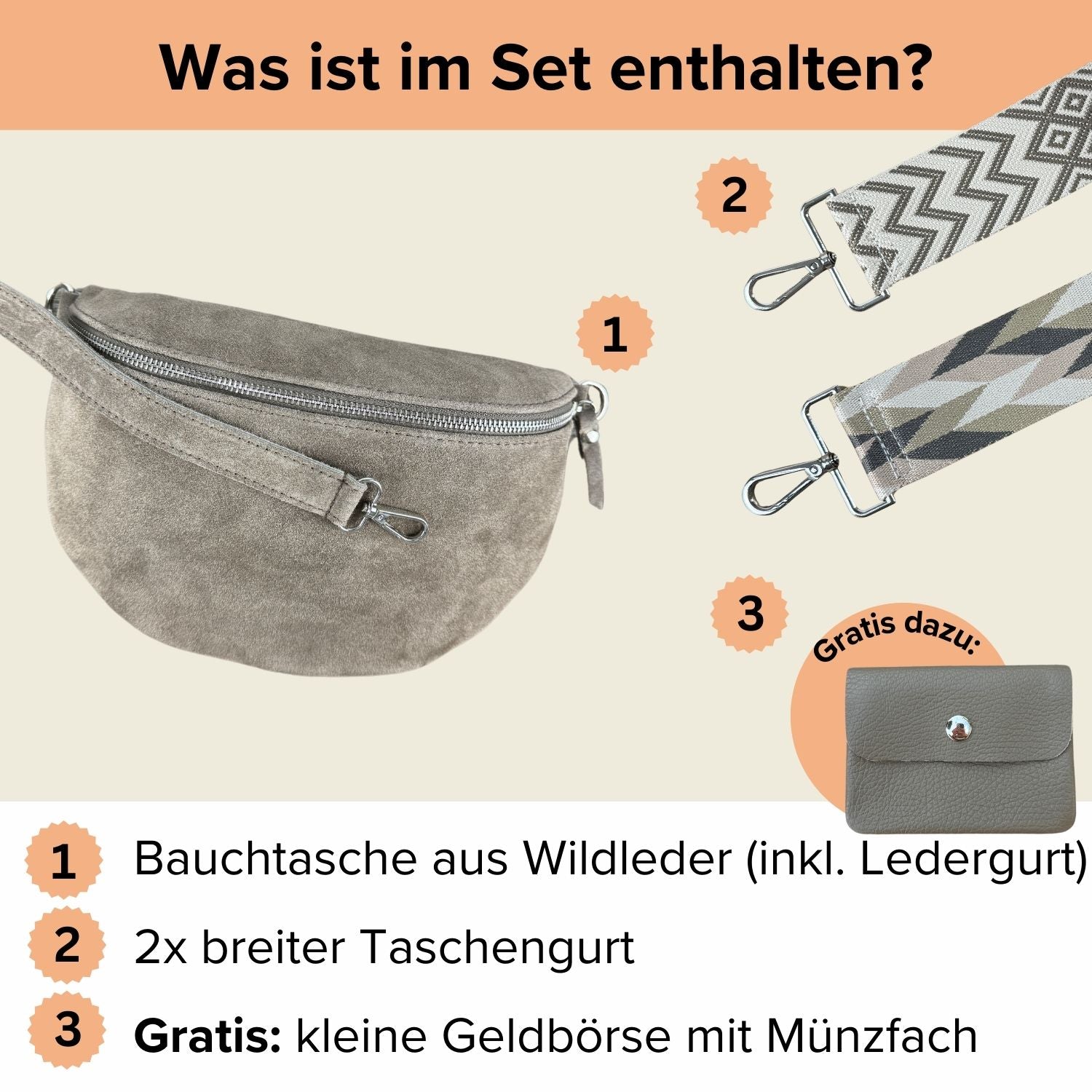 Die Bauchtasche und Geldbörse sind aus Echtleder gefertigt. Die breiten Taschengurte sind aus Polyester gefertigt. Aufgrund der Lichtverhältnisse und des Echtleders können die Farben leicht abweichen.