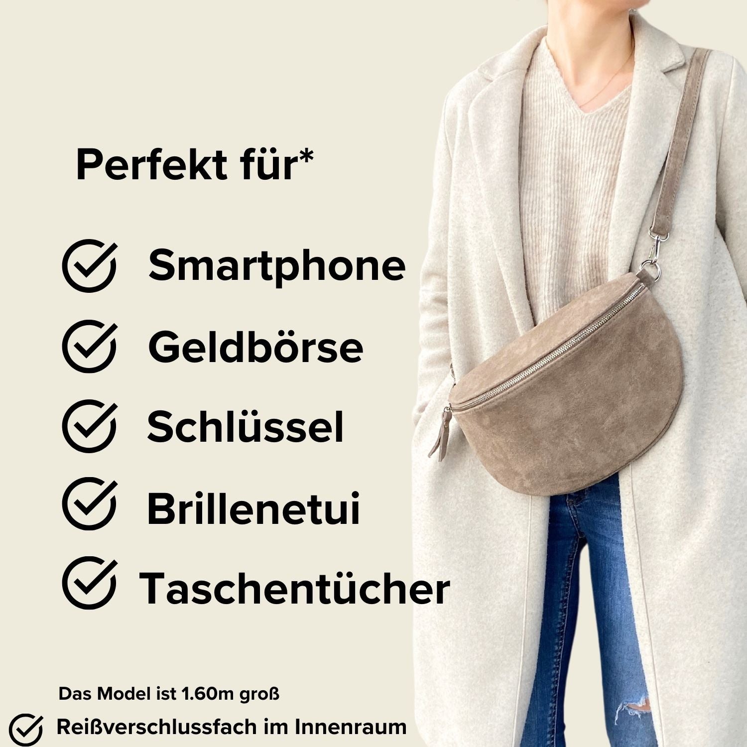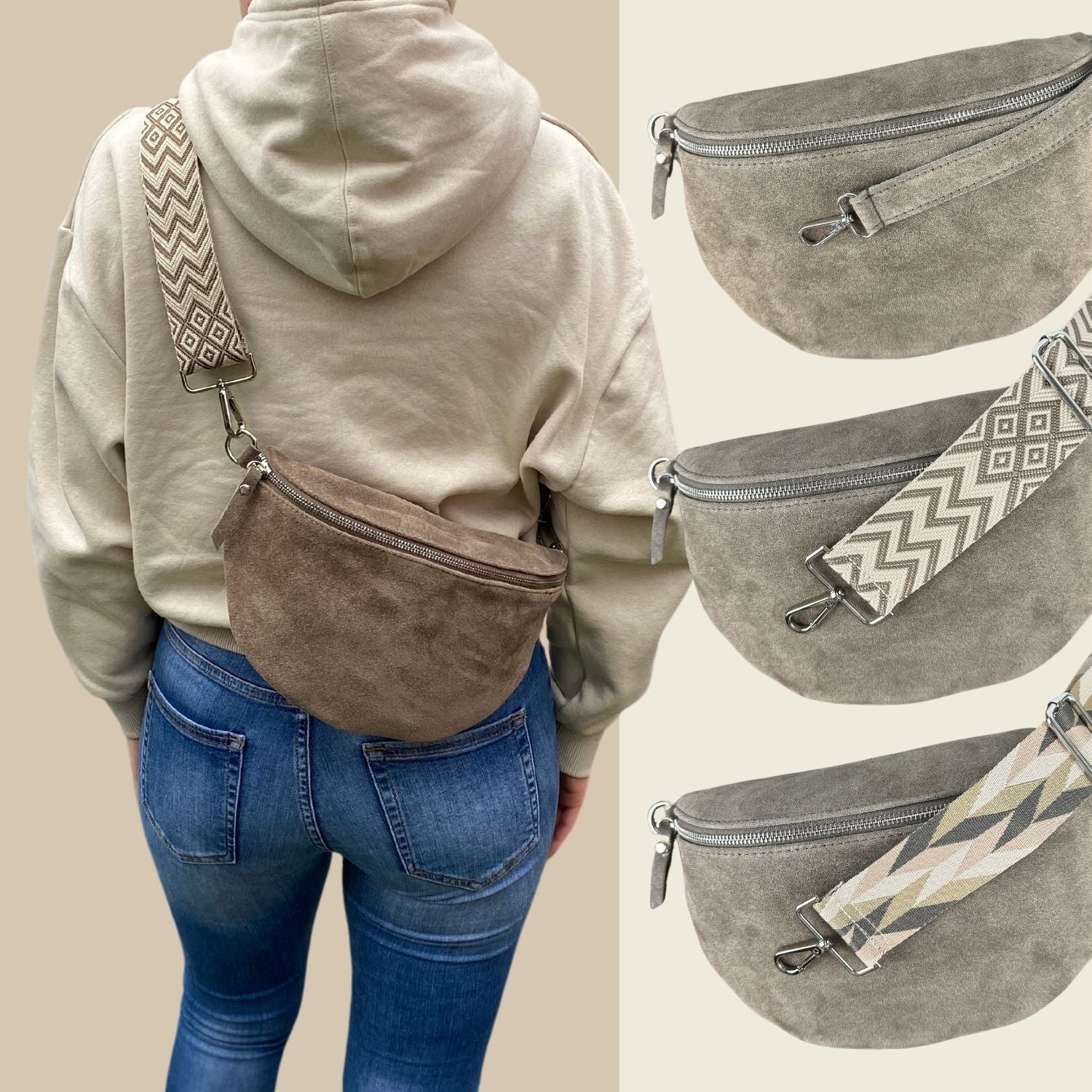 1x große Bauchtasche aus Wildleder mit schmalem Ledergurt in dunkeltaupe