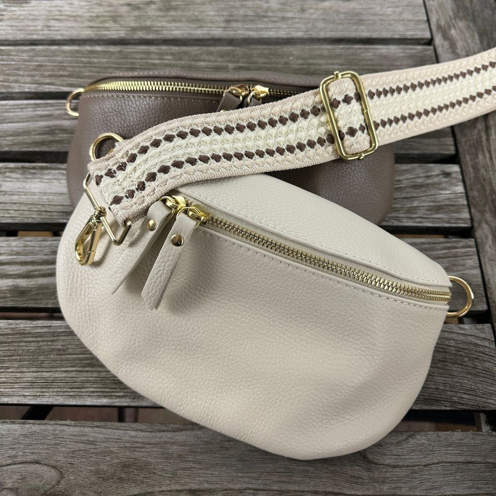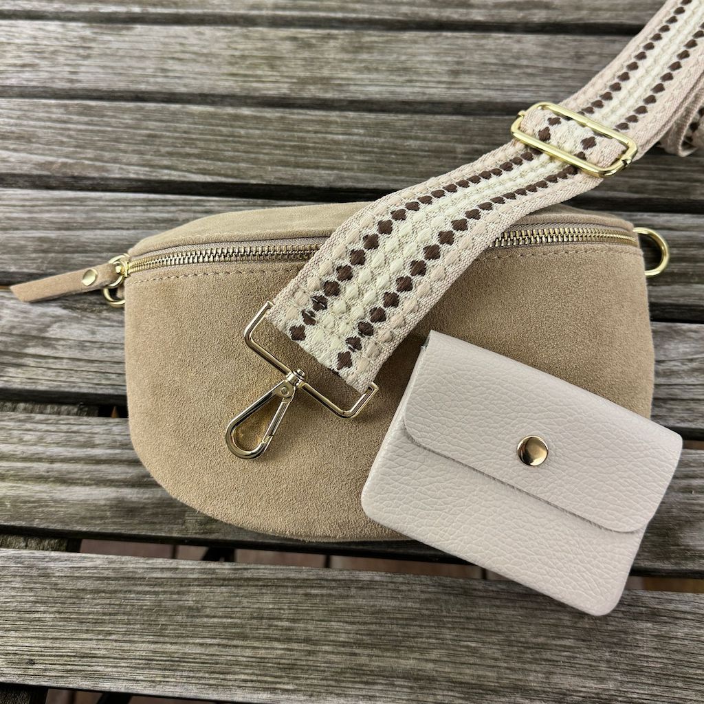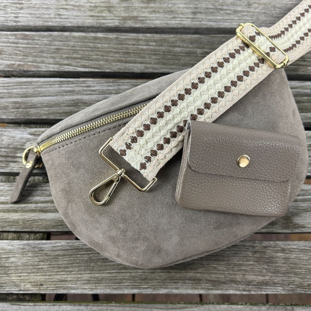 mittelgroße Bauchtasche aus Wildleder in taupe, große Bauchtasche aus Wildleder in dunkeltaupe, mittelgroße Bauchtaschen aus Leder in beige und dunkeltaupe