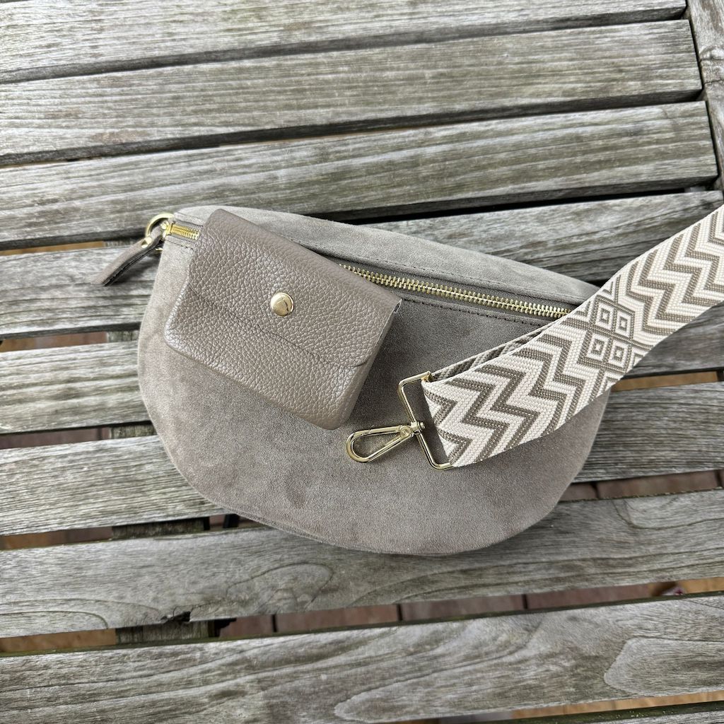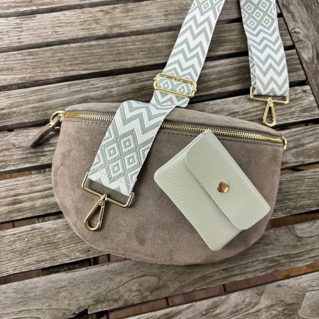 Mira / grün weiß: große Bauchtasche aus Wildleder in dunkeltaupe