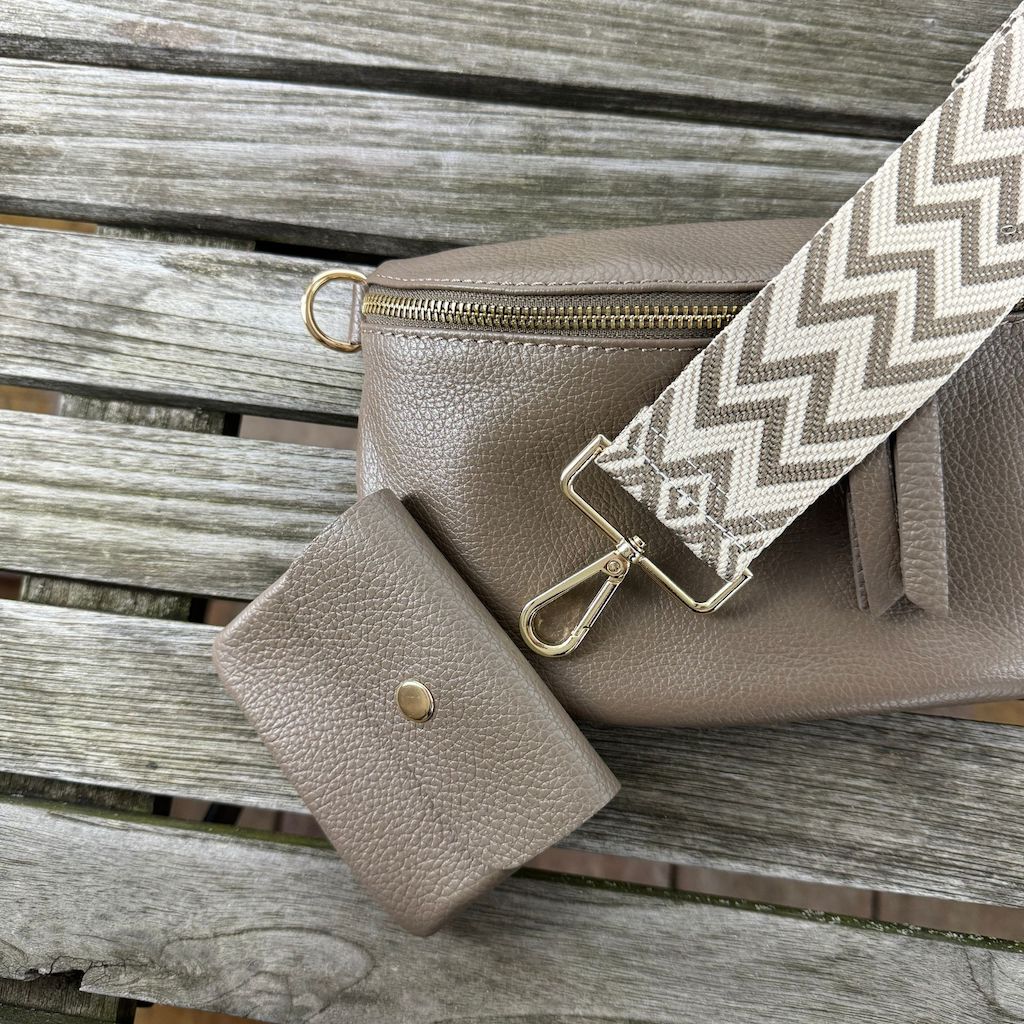 Mira / dunkeltaupe: große Bauchtasche aus Wildleder in dunkeltaupe, mittelgroße Taschen aus Leder in beige und dunkeltaupe