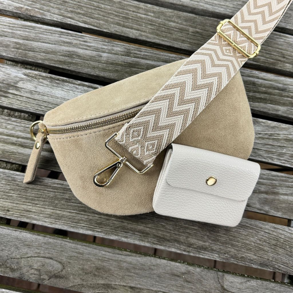 Mira / beige: mittelgroße Bauchtasche aus Wildleder in taupe