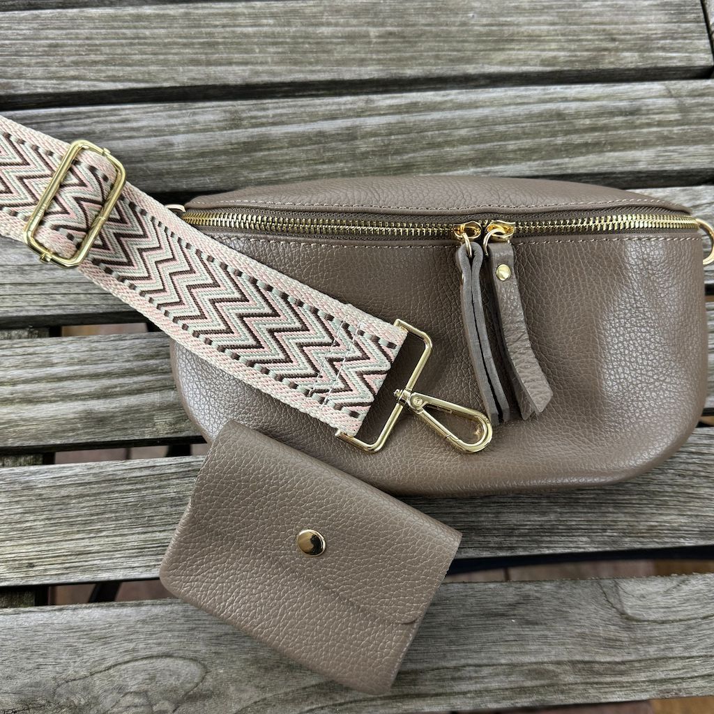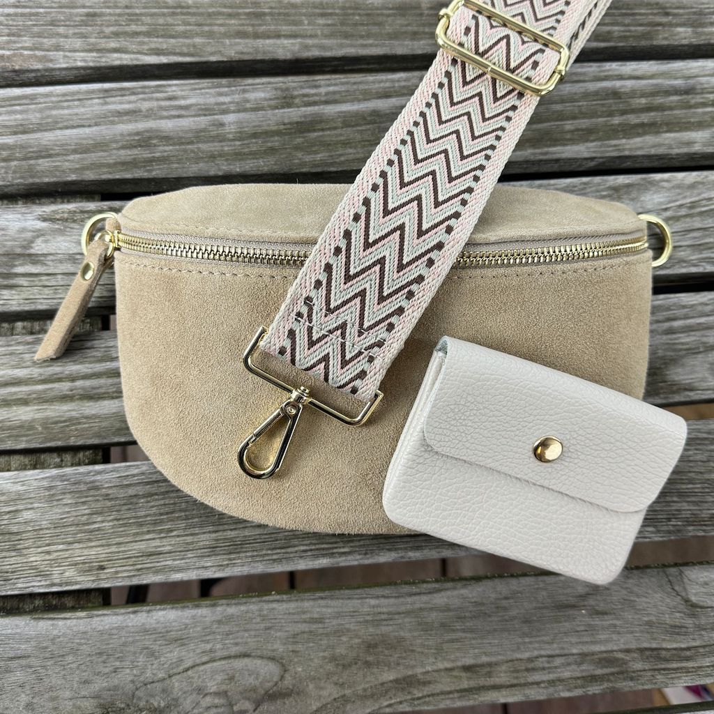 mittelgroße Bauchtasche aus Wildleder in taupe, mittelgroße Bauchtasche aus Leder in dunkeltaupe, mittelgroße Bauchtasche aus Leder in beige
