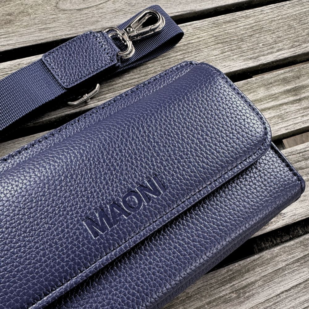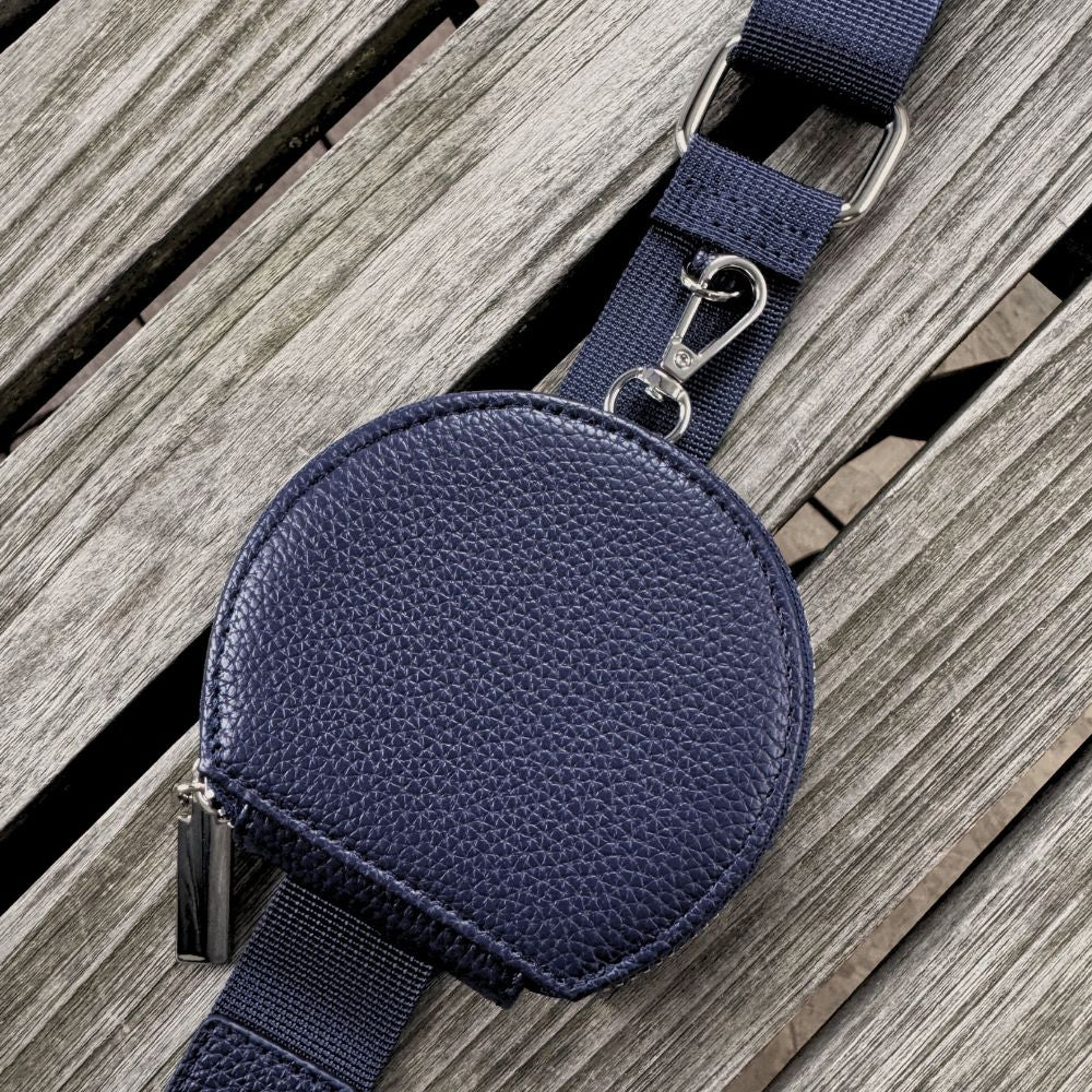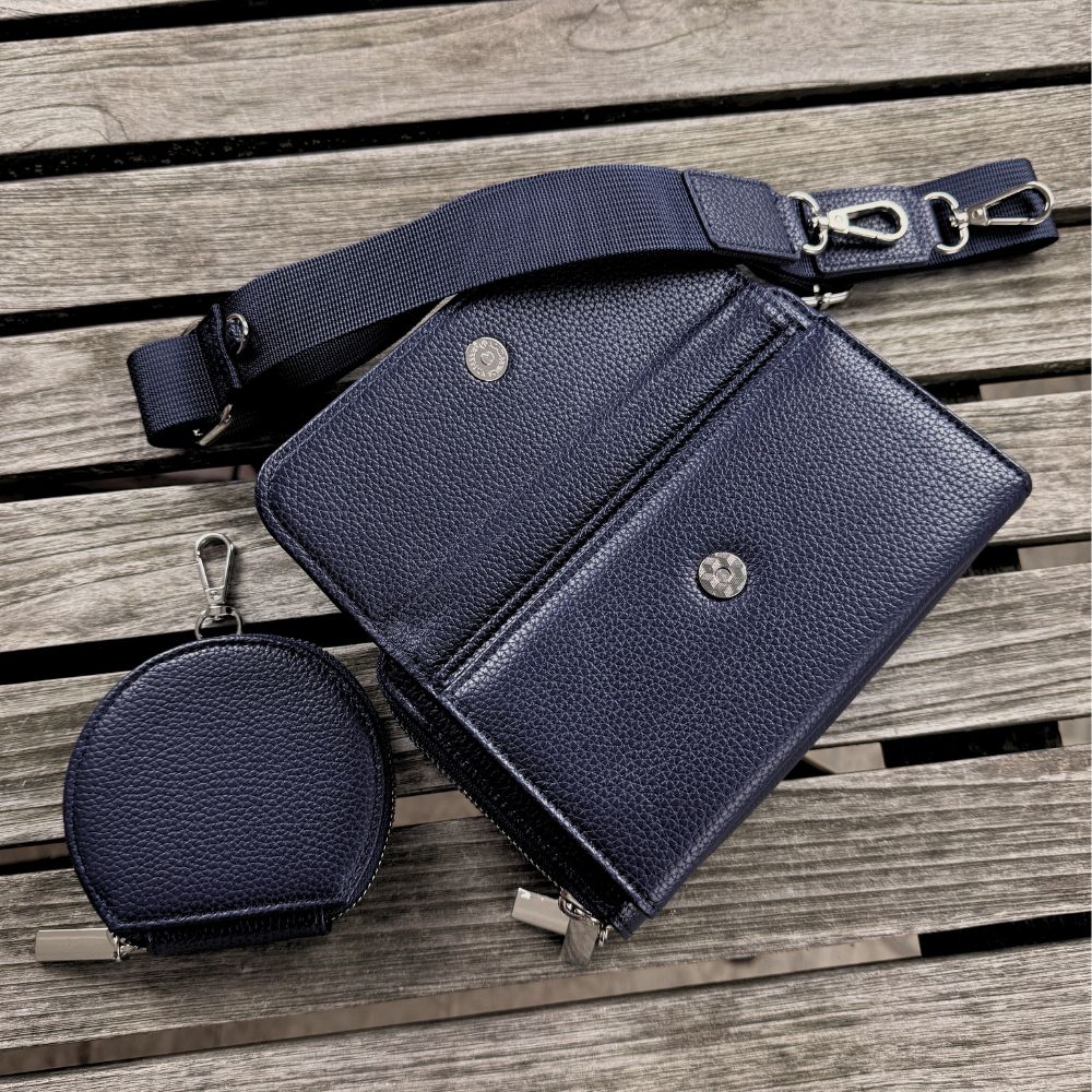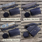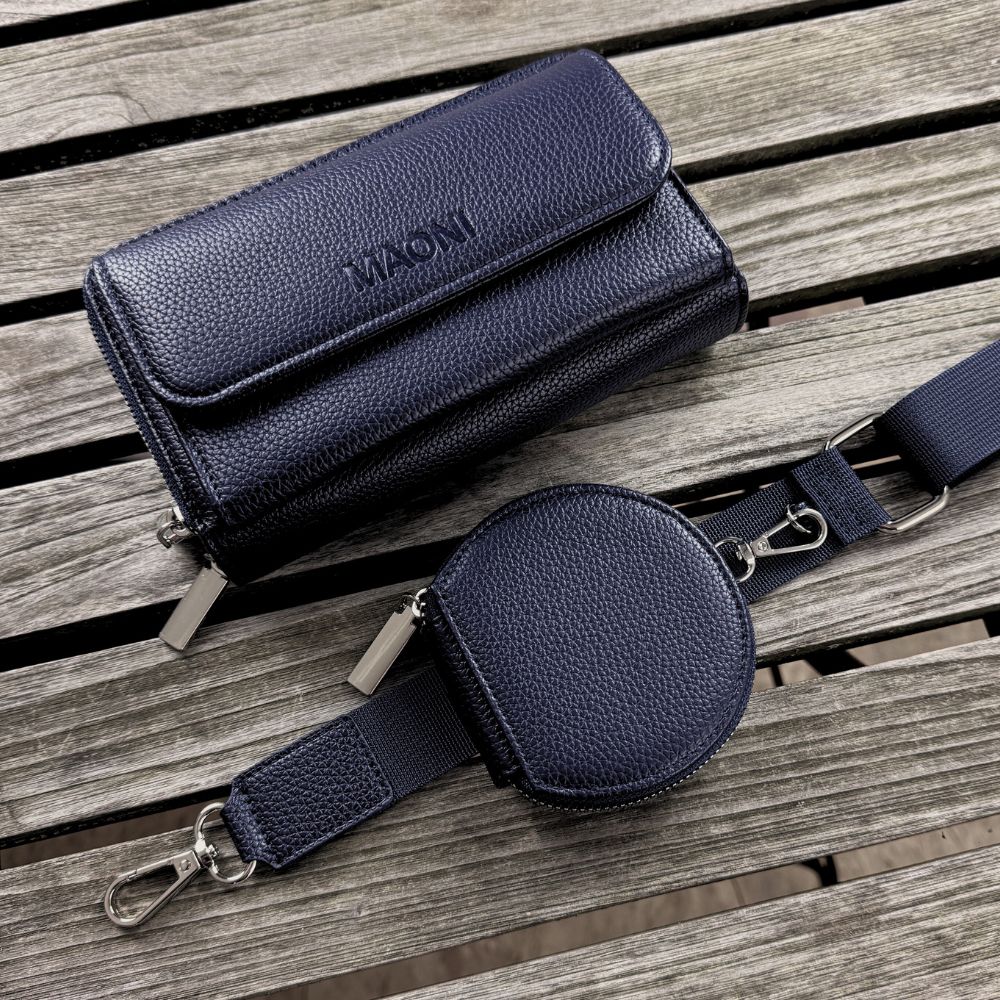 Im Lieferumfang enthalten ist eine dunkelblaue Handytasche zum Umhängen, ein einfarbiger Schultergurt, eine kleine Münztasche sowie ein weiterer Taschengurt deiner Wahl (Set-Option).