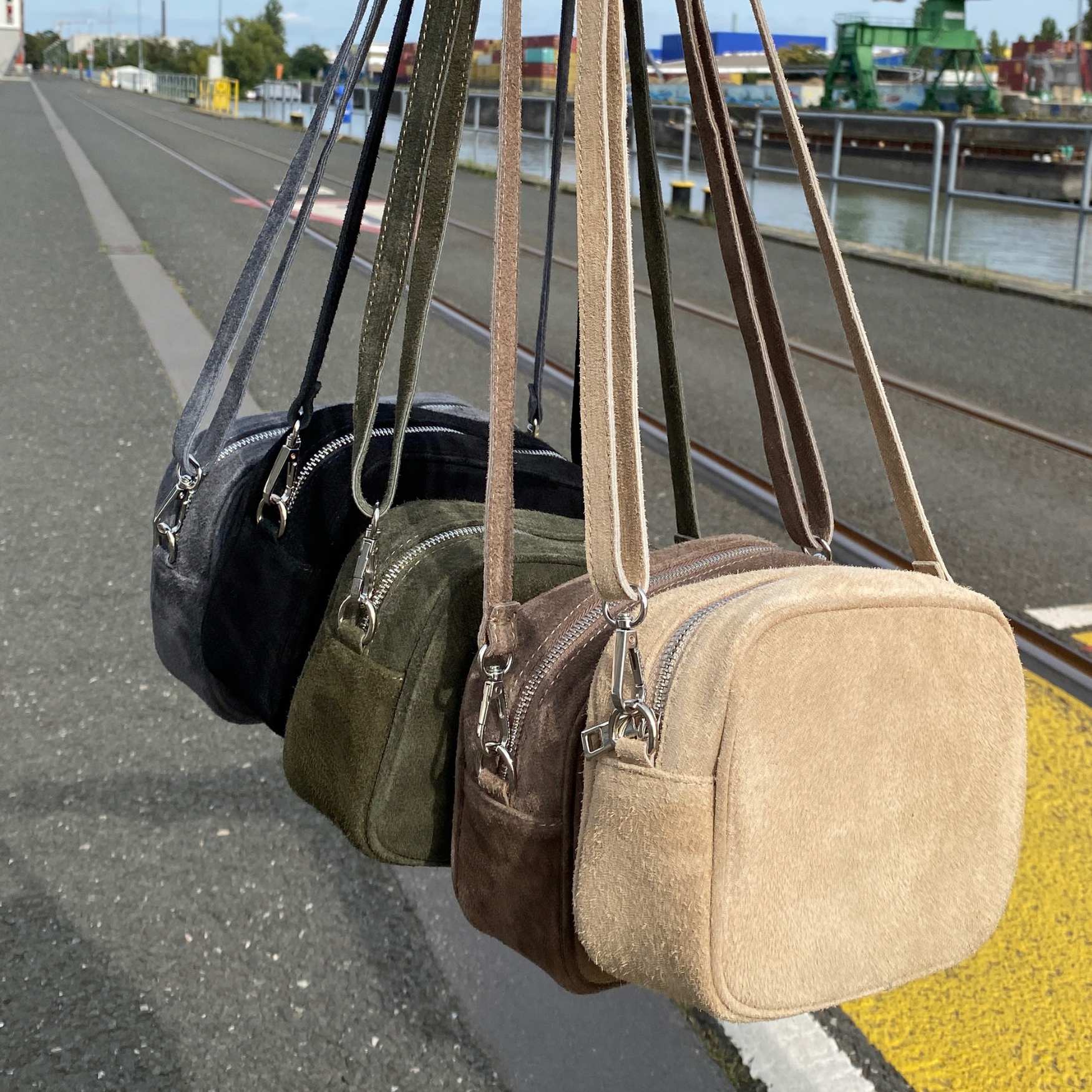 Unsere Wildleder Crossbodytasche besteht aus Echtleder (Veloursleder). Das Material zeichnet sich durch die raue und angenehme Oberfläche aus.