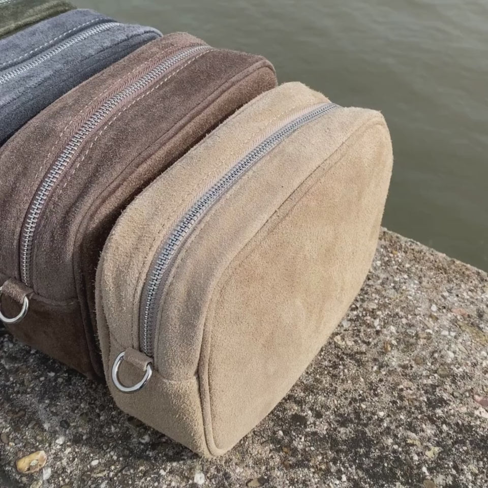Die Tasche und der Taschengurt ist aus Wildleder (Veloursleder) gefertigt. Aufgrund der Lichtverhältnisse und des Materials kann es zu leichten Farbabweichungen kommen.