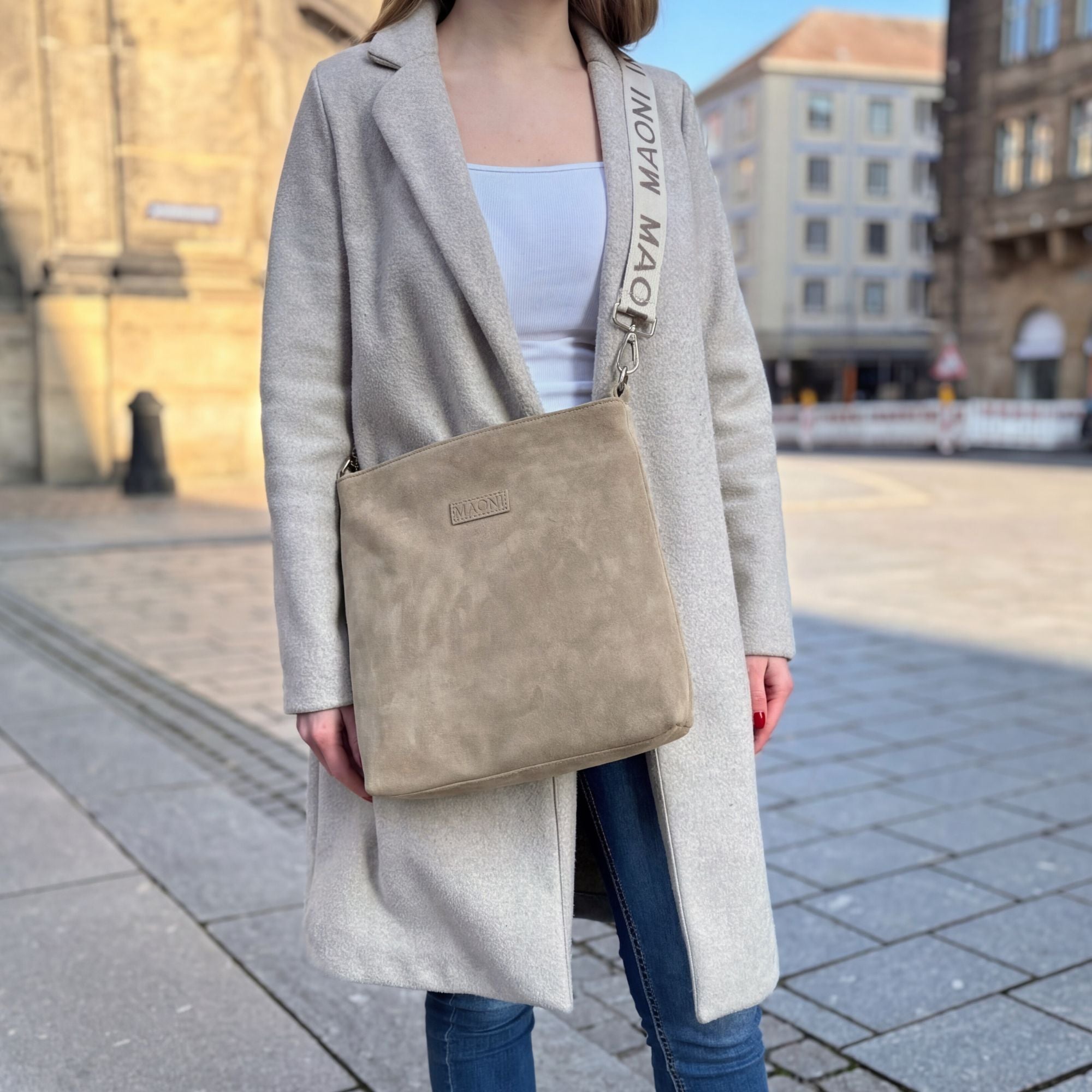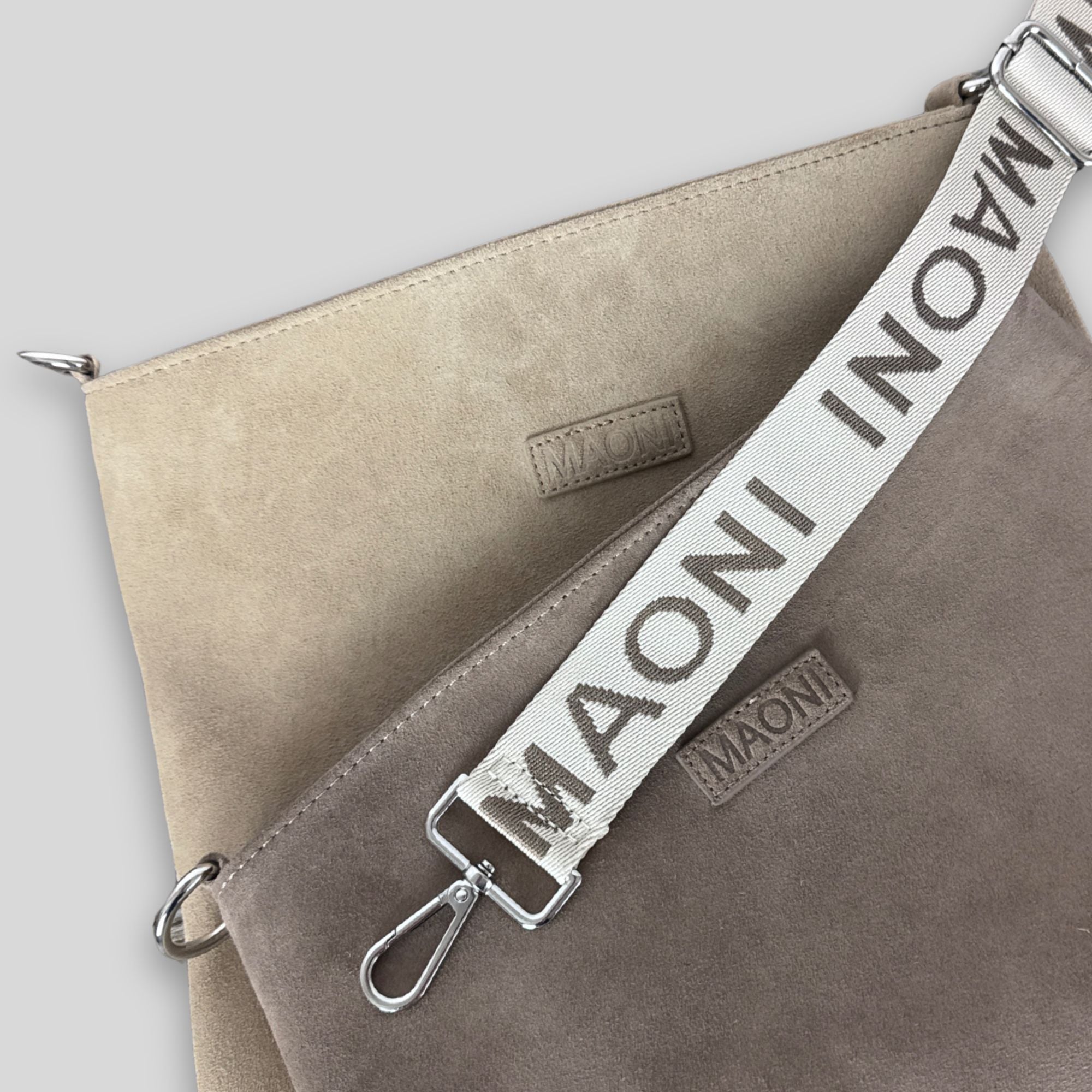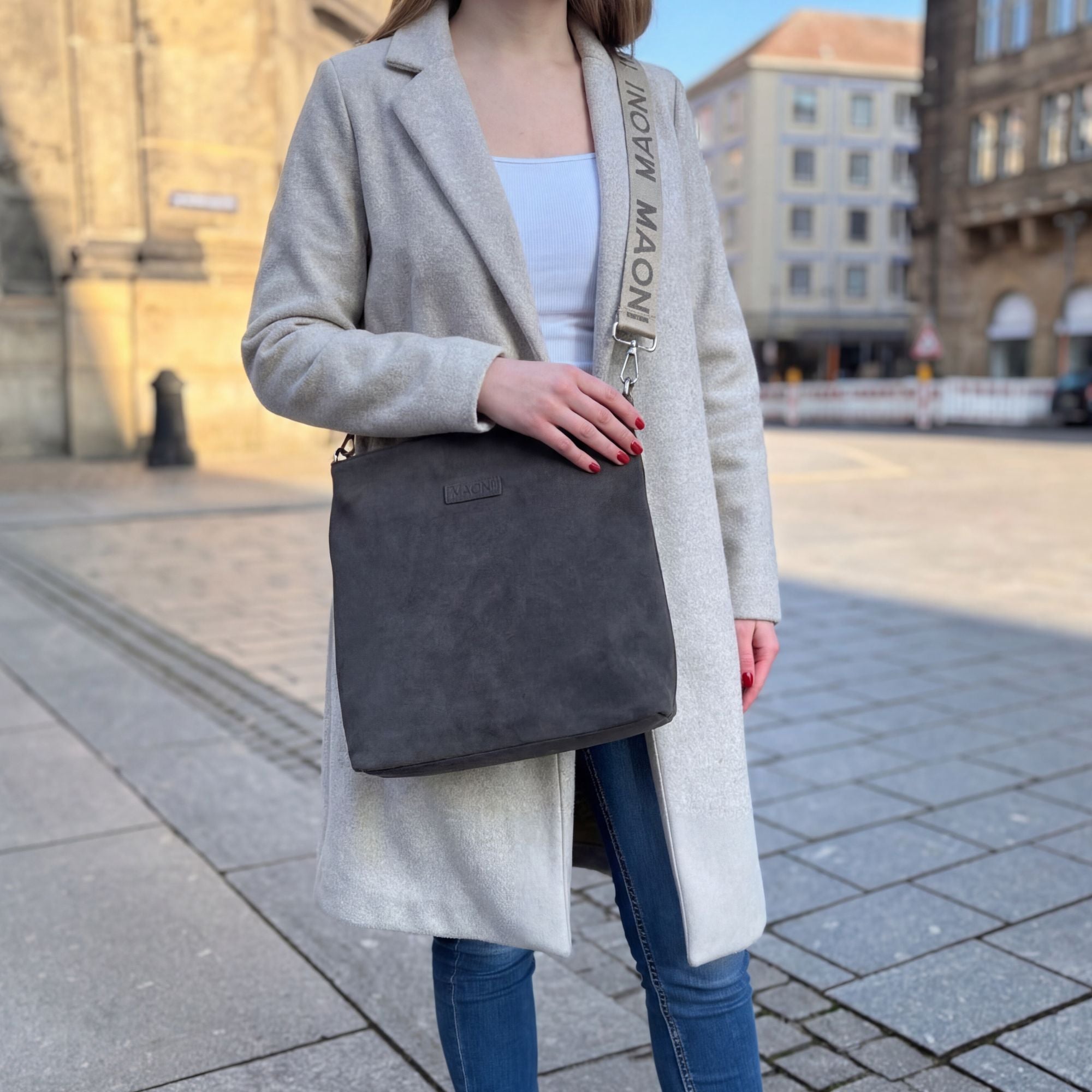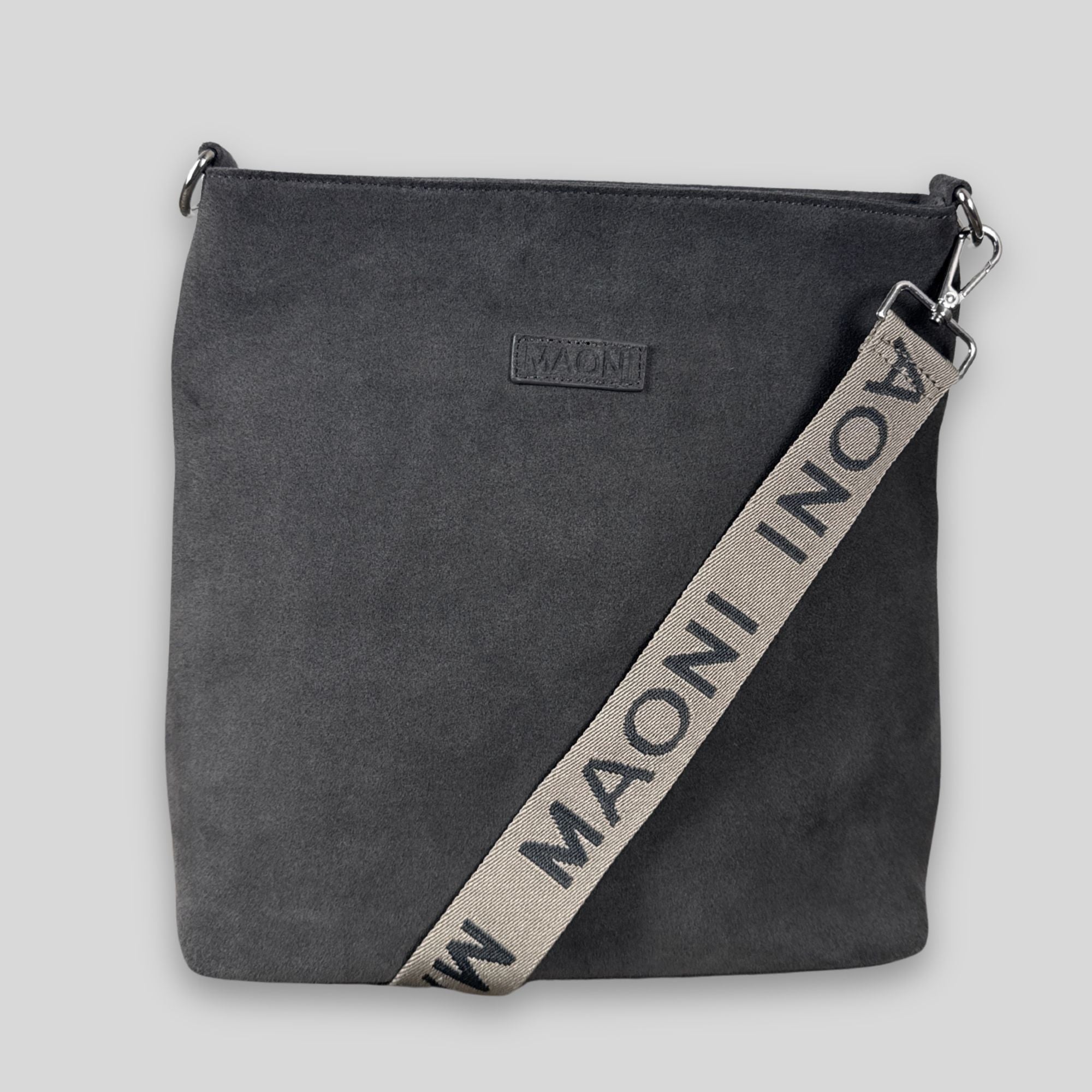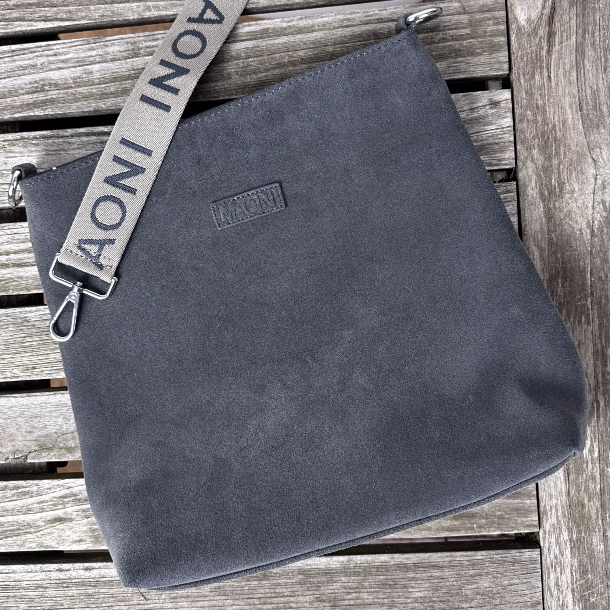 Im Lieferumfang enthalten ist unsere Umhängetasche inkl. des zweifarbigen MAONI Logo-Gurts, den du auf den Produktbildern siehst. Der Gurt lässt sich bis ca. 140 cm verstellen.