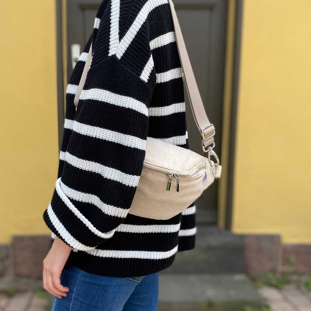 Die Bauchtasche ist aus Cord gefertigt. Der Innenraum der Tasche ist beige. Aufgrund der Lichtverhältnisse können die Farben leicht abweichen.