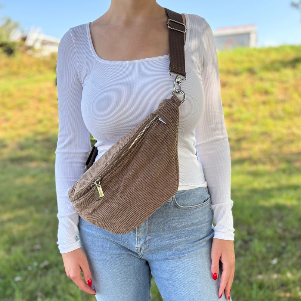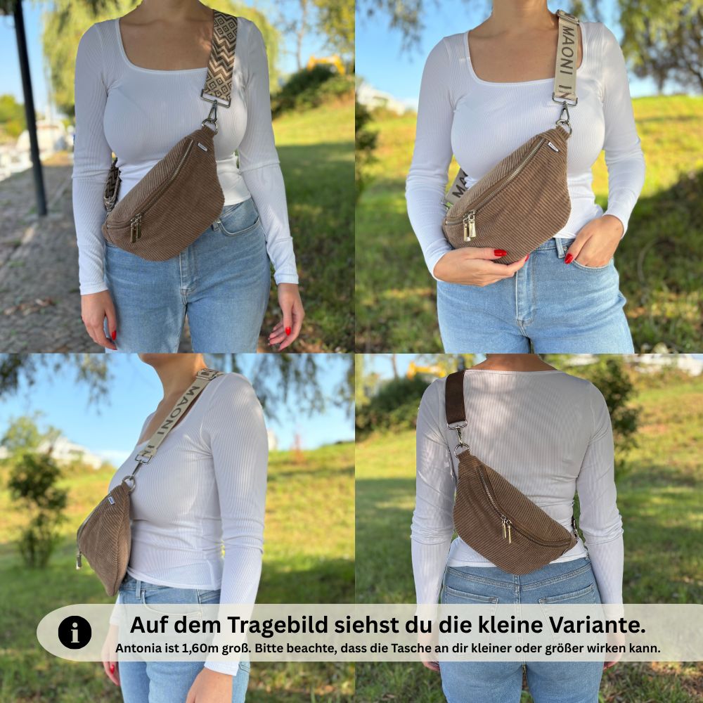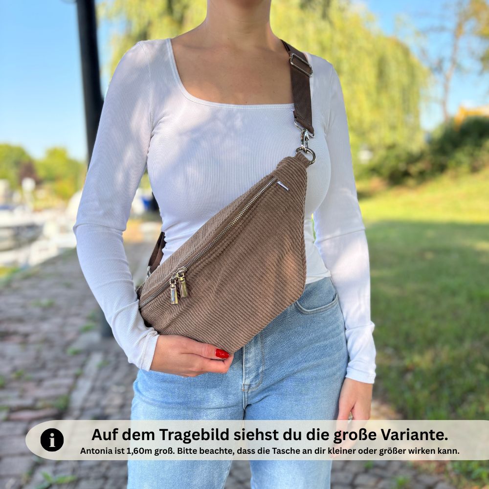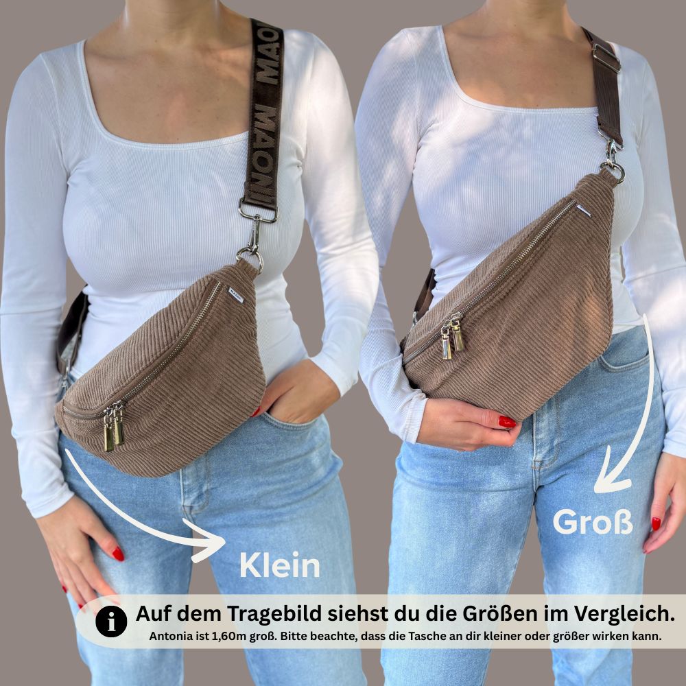 Unsere Bauchtasche aus Cord ist in zwei verschiedenen Größe erhältlich.