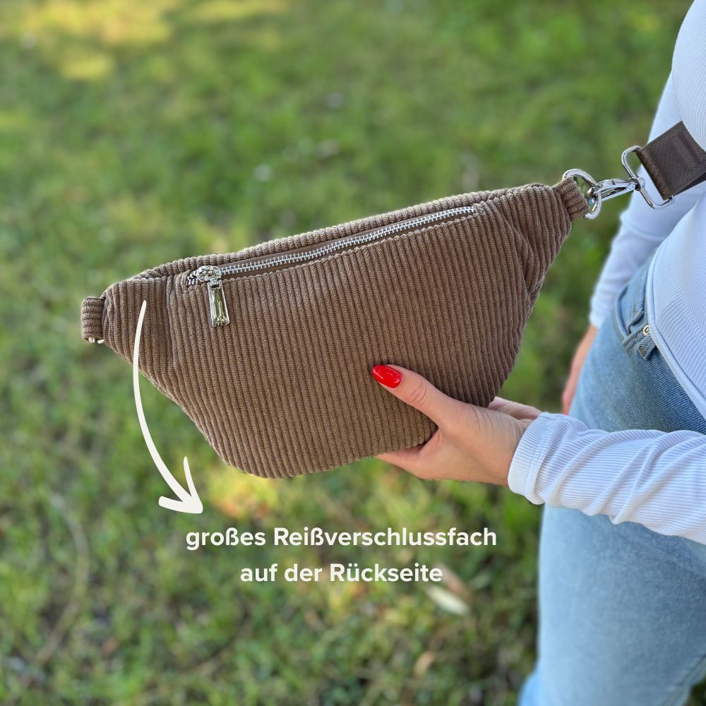 Die Bauchtasche ist aus Cord gefertigt. Der Innenraum der Bauchtasche ist beige gehalten. Aufgrund der Lichtverhältnisse können die Farben leicht abweichen.