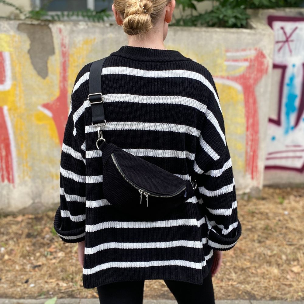Unsere schwarze Bauchtasche aus Cord ist in zwei verschiedenen Größen erhältlich. Die Maße sind am breitesten Punkt des Taschenkörpers gemessen. Bitte bedenke, dass die Tasche nach unten schmaler wird.