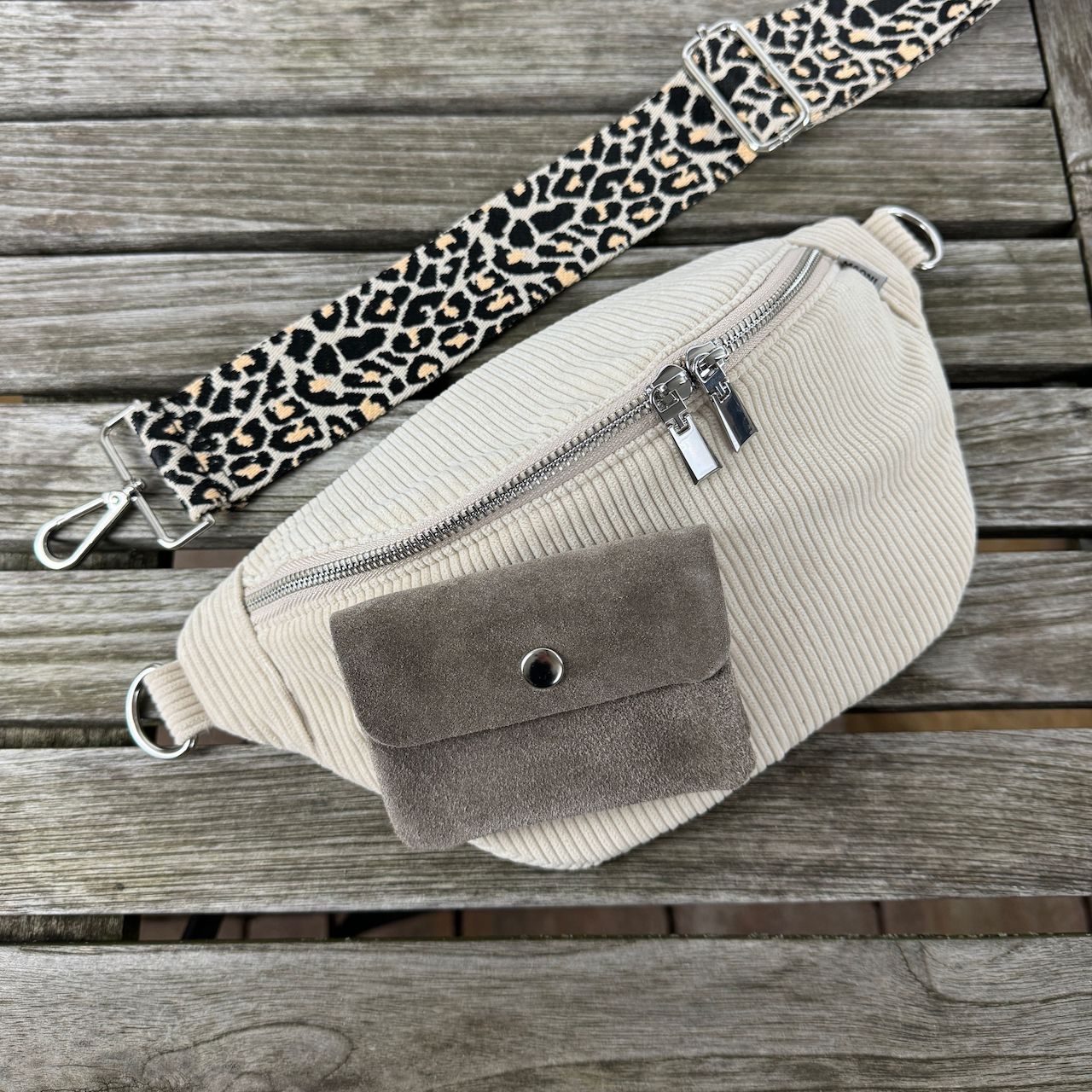 Die Bauchtasche ist aus Cord gefertigt. Der Innenraum der Bauchtasche ist beige gehalten. Aufgrund der Lichtverhältnisse können die Farben leicht abweichen.