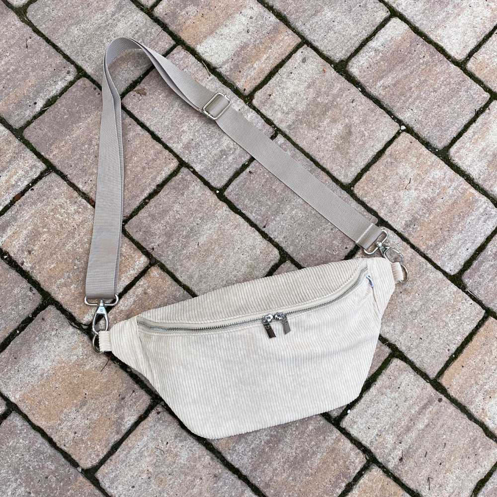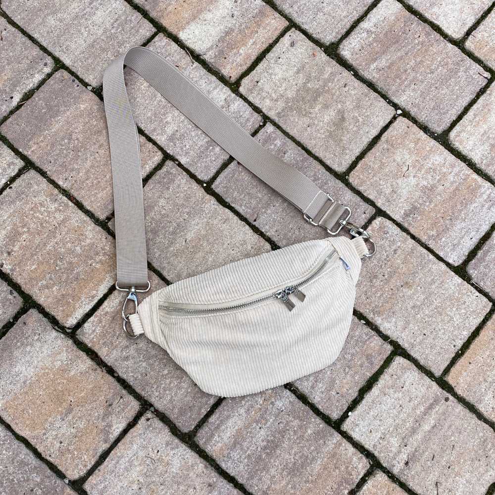 Im Lieferumfang enthalten ist unsere beige Bauchtasche aus Cord mit einem einfarbigen und längenverstellbaren Taschengurt.