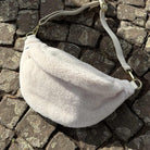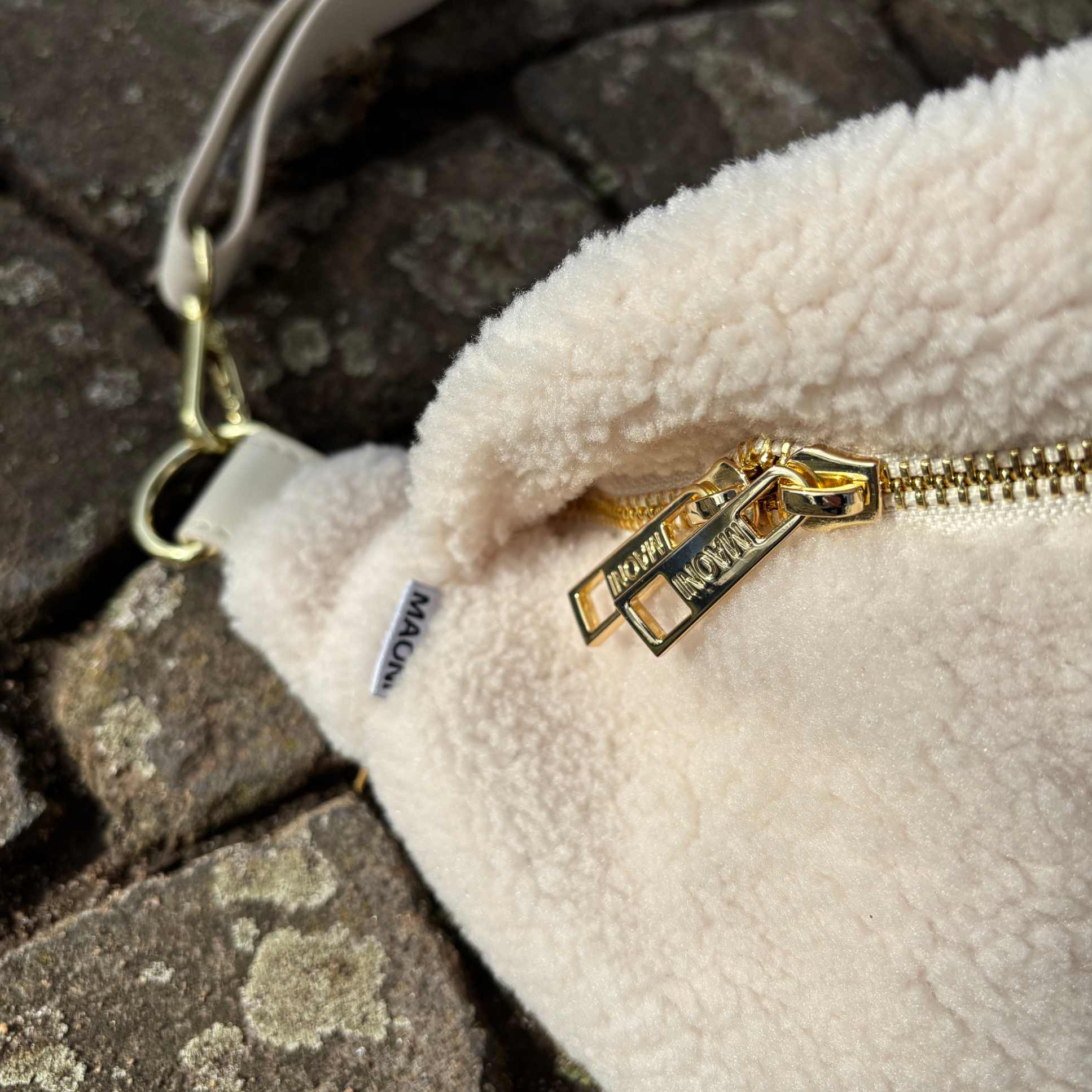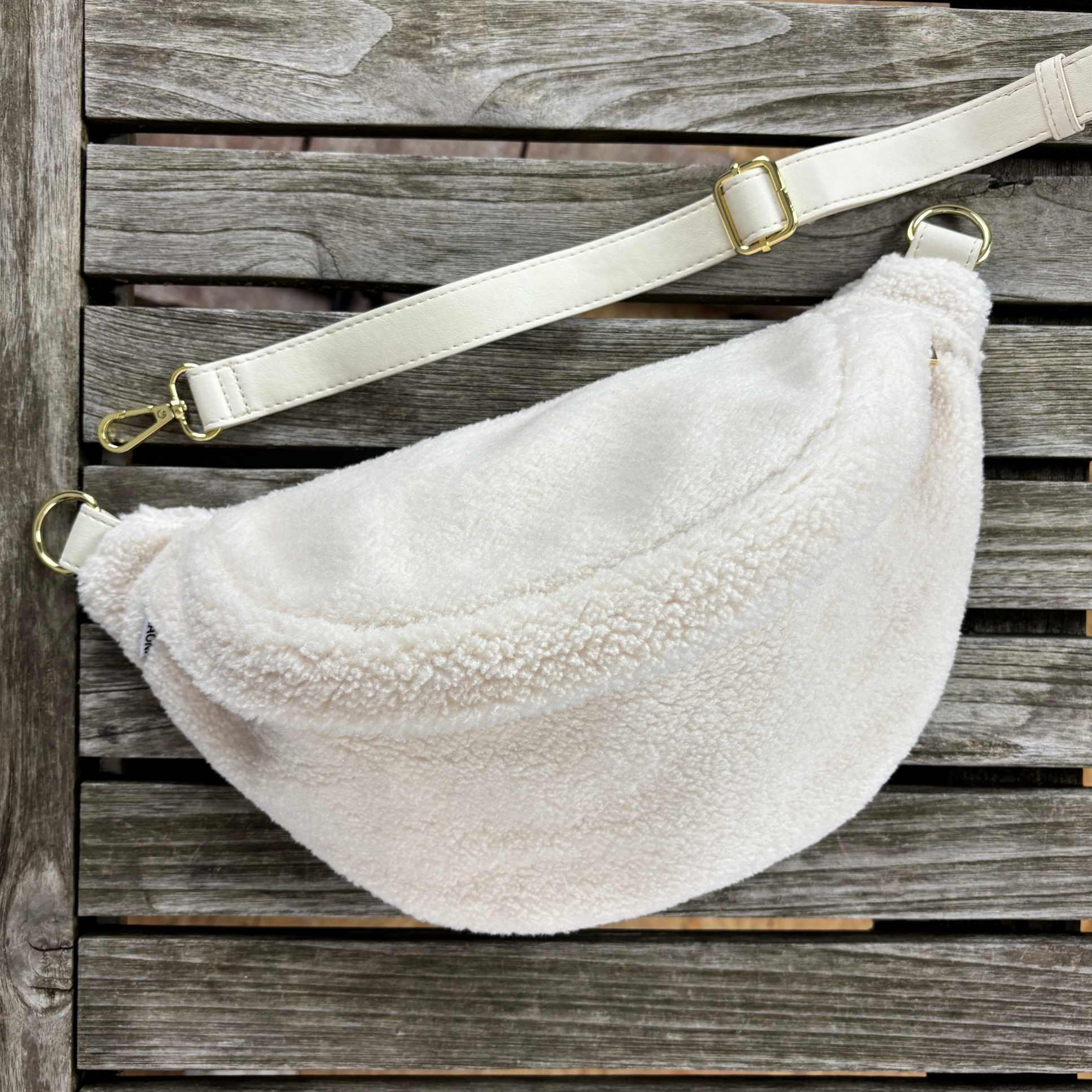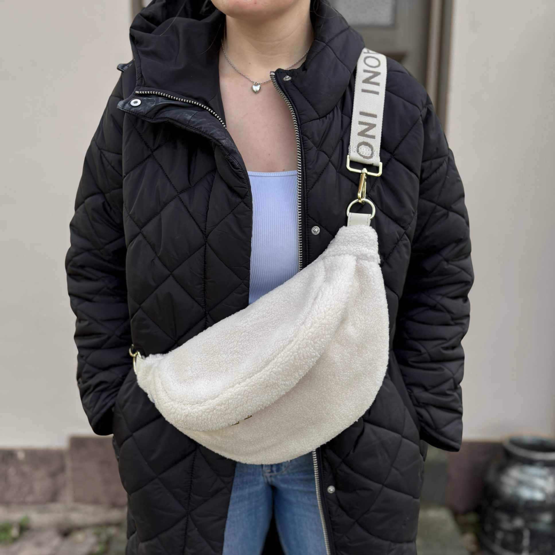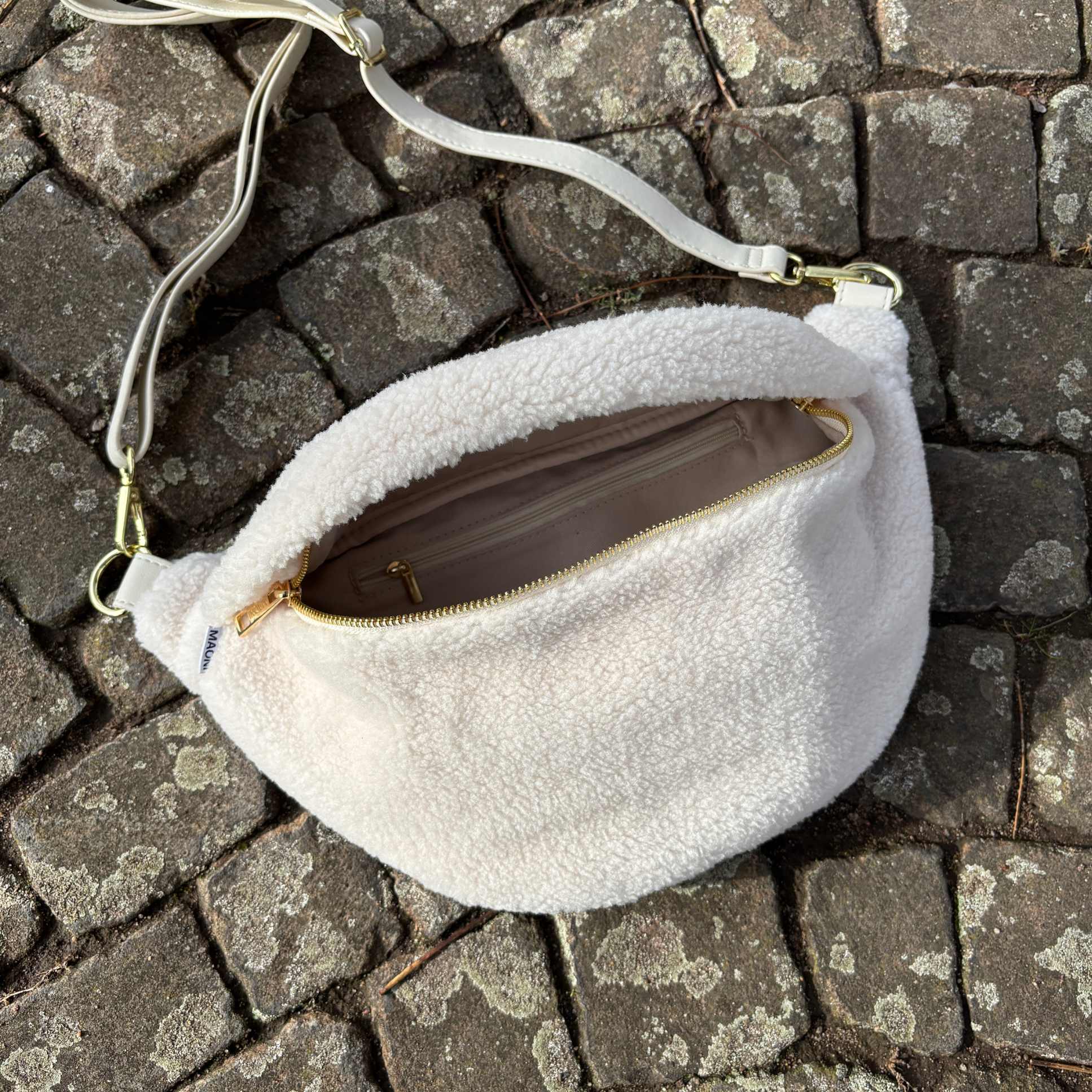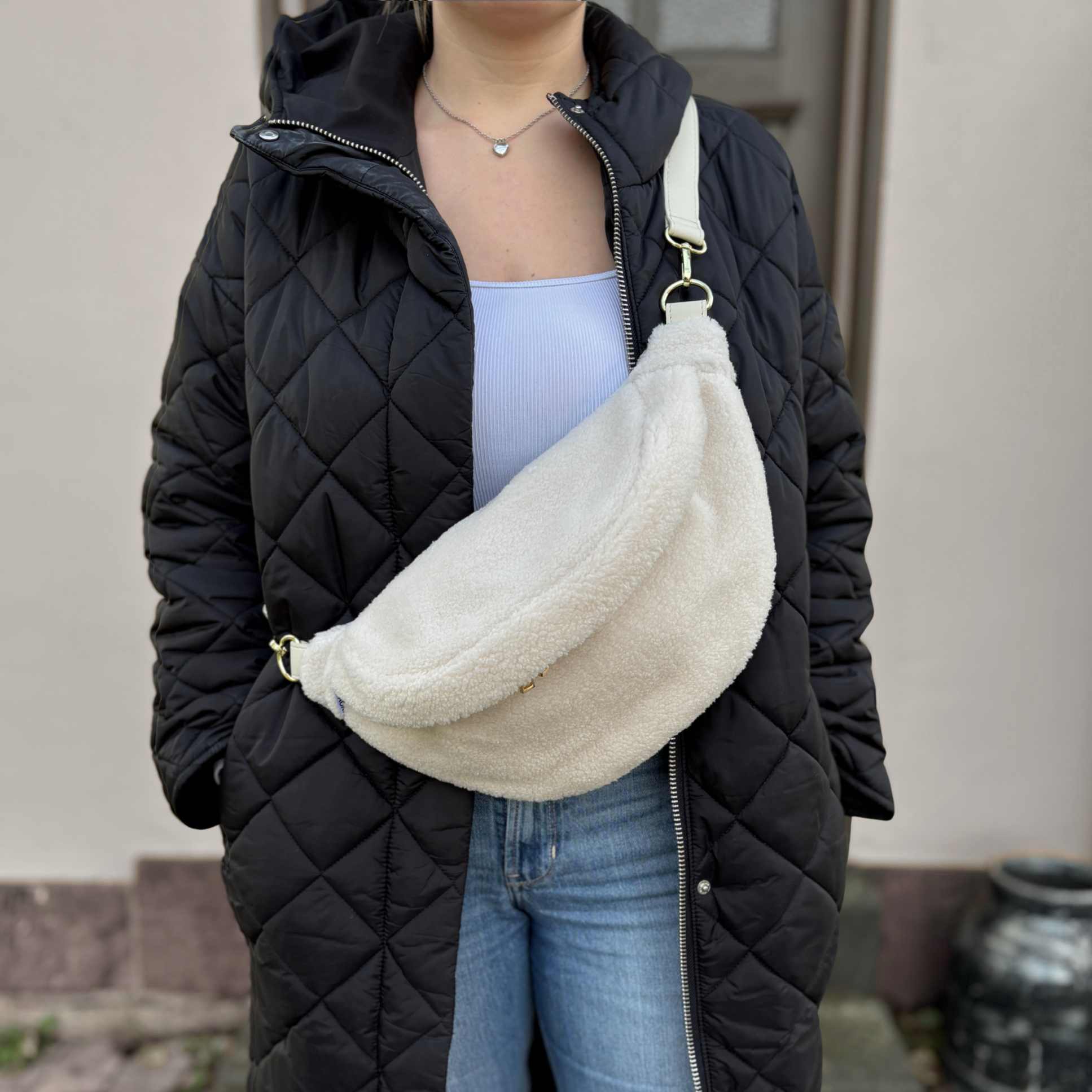 Im Lieferumfang enthalten ist unsere beige Bauchtasche im angesagten Fell-Look und ein einfarbiger Taschengurt. Die Hardware der Tasche ist goldfarben.