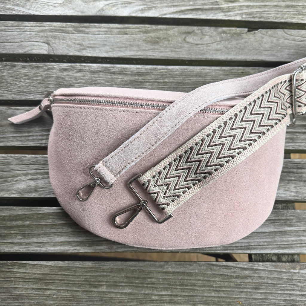 Unsere Bauchtasche verfügt über silberfarbene Hardware, bestehend aus robusten Karabinern und einem langlebigen Reißverschluss. Die silberne Farbe verleiht der Tasche einen eleganten Touch und harmoniert perfekt mit der Farbe des Wildleders.