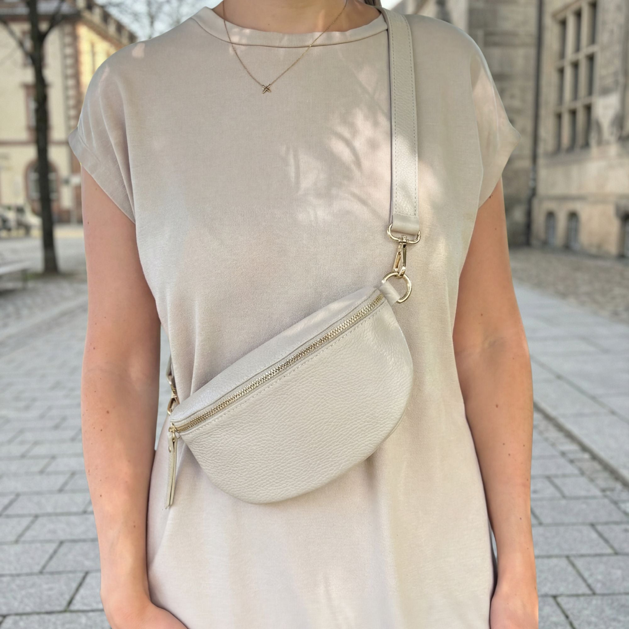 Du suchst nach einem beigen Taschenset mit silberner Hardware? Schaue dir gerne dieses Bauchtaschen Set an!