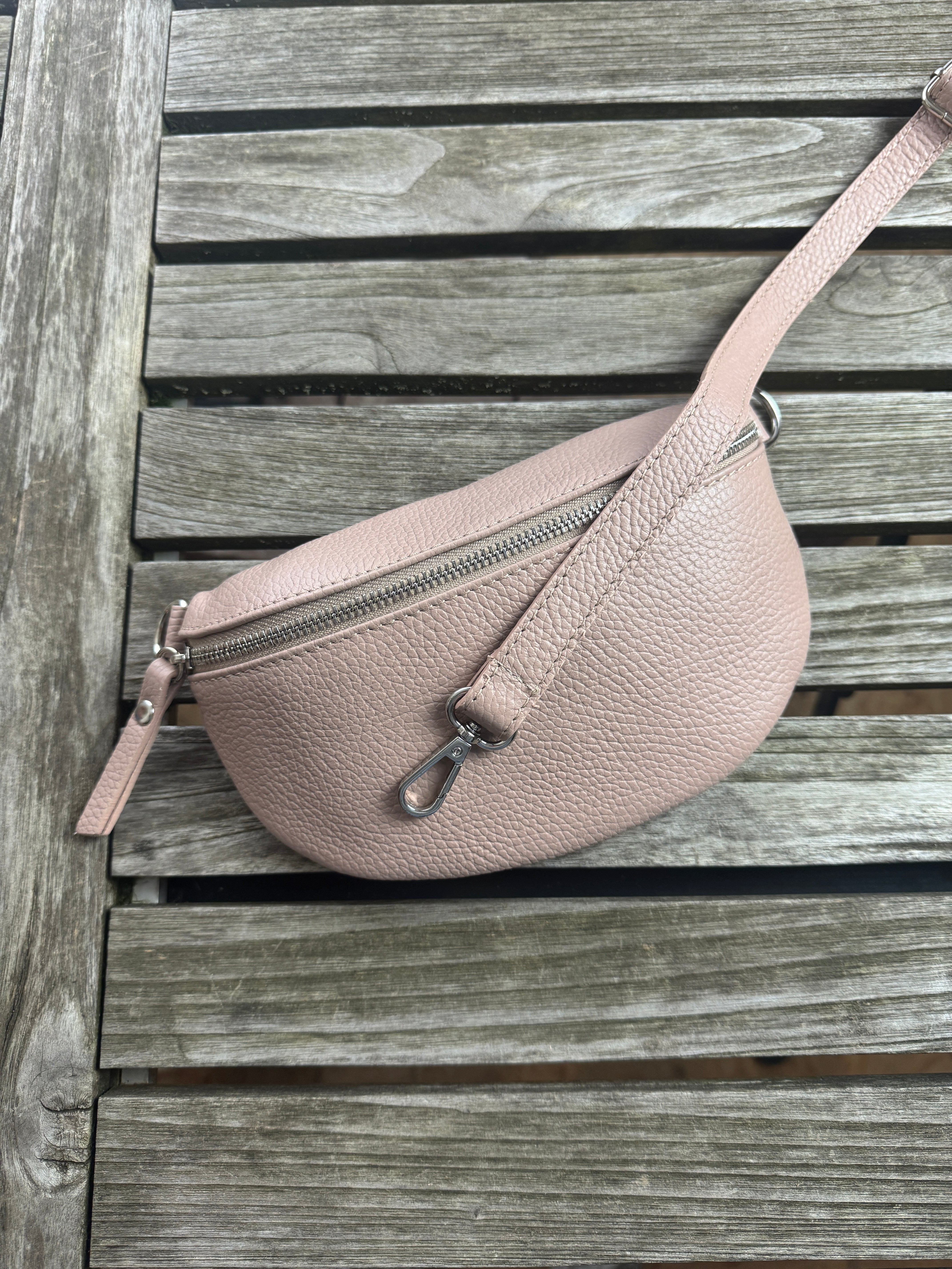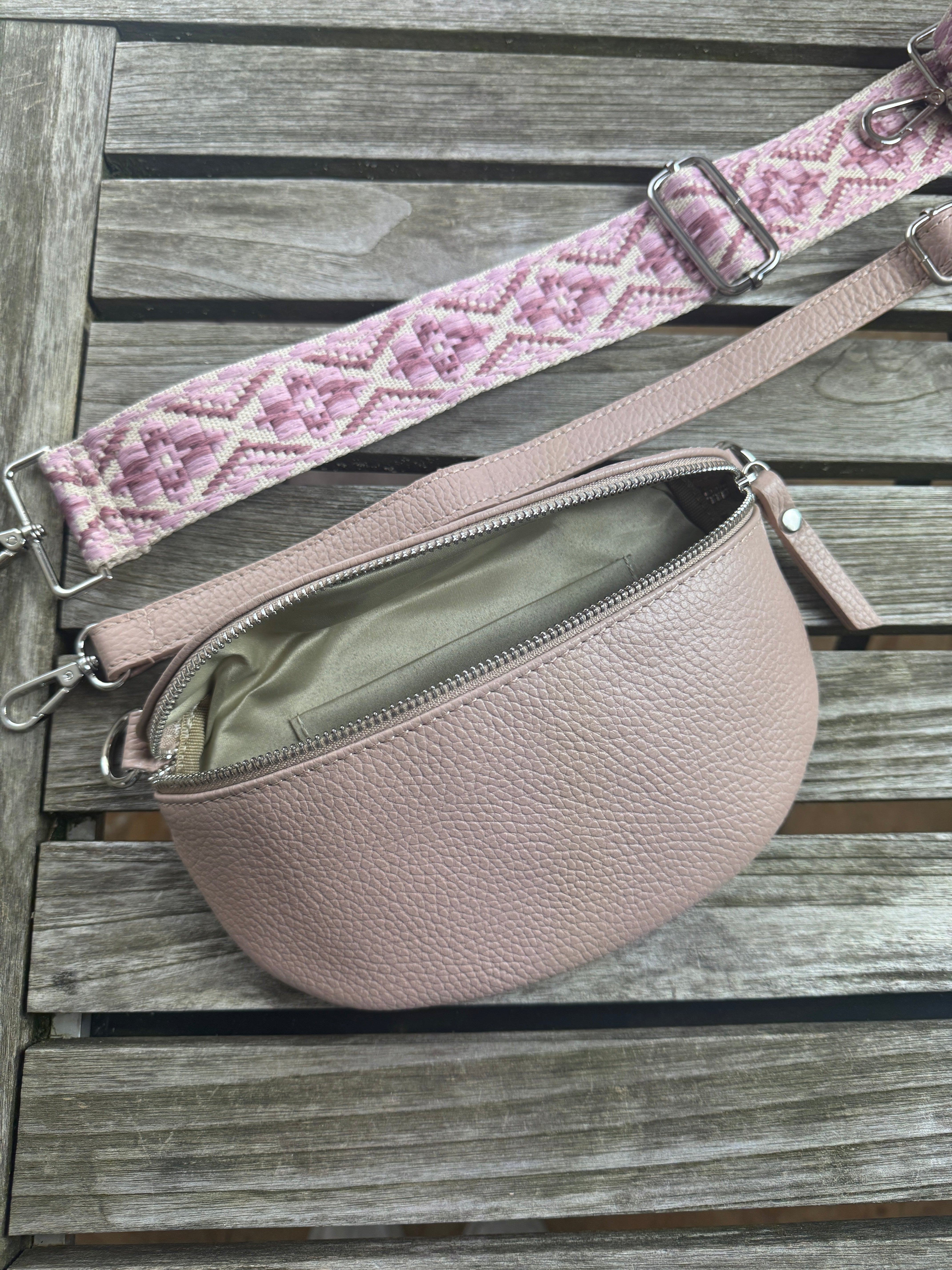Im Lieferumfang enthalten ist eine kleine Lederbauchtasche mit einem schmalen Ledergurt und breitem Taschengurt Fiona / rosa. Die Bauchtasche verfügt über eine Innentasche mit einem eingenähten Fach für Geld oder Karten. Beide Taschengurte sind in der Länge verstellbar.