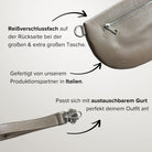 Die Bauchtasche hat silberne Reißverschlüsse und Karabiner.