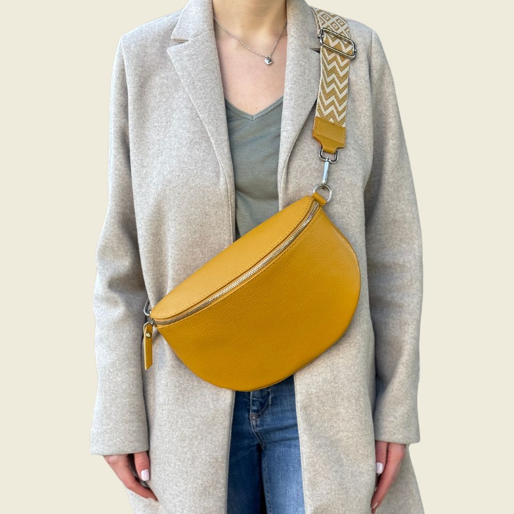 Im Lieferumfang enthalten ist eine senfgelbe Bauchtasche aus Leder mit einem schmalen Ledergurt, sowie einem farblich abgestimmten breiten Schultergurt nach Wahl.