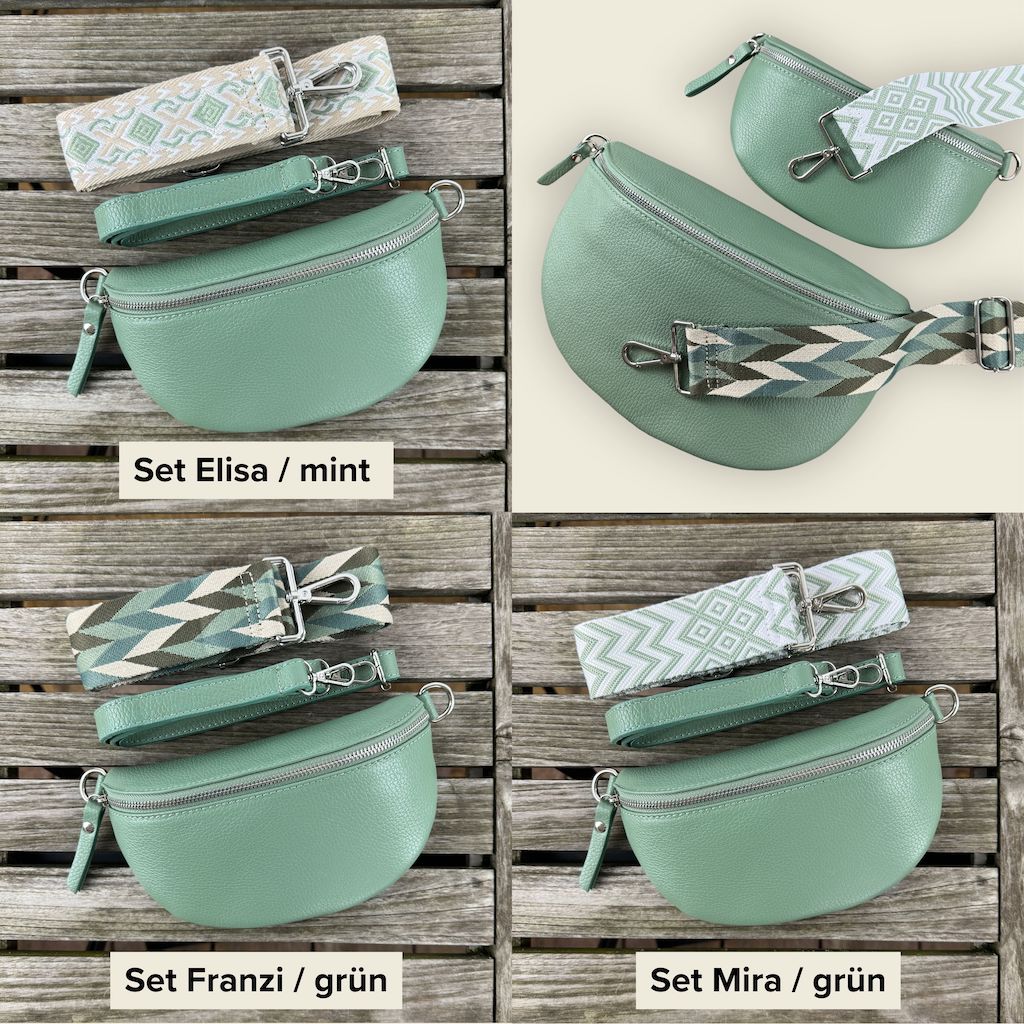 Im Lieferumfang enthalten ist eine grüne Bauchtasche aus Leder mit einem schmalen Ledergurt, sowie einem farblich abgestimmten breiten Gurt nach Wahl.