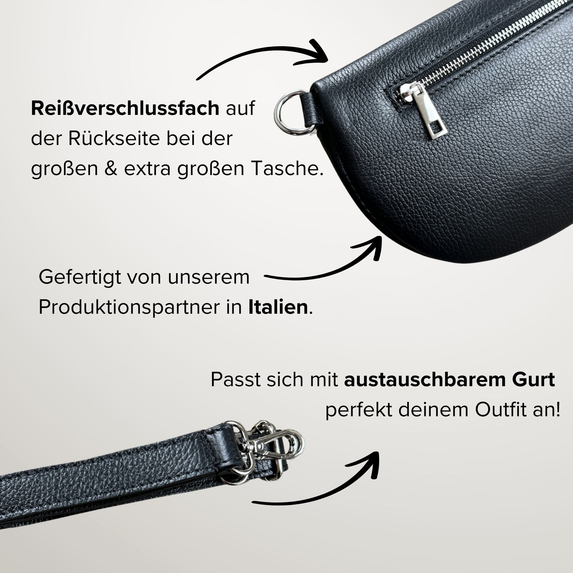 Unsere Tasche verfügt über abnehmbare und in der Länge verstellbare Taschengurte, die es dir ermöglichen die Tasche individuell zu tragen. Die schwarze Bauchtasche ist aus hochwertigem Leder handgefertigt und bietet genug Platz für alle deine wichtigen Gegenstände. Verleihe deinem Outfit mit unserer praktischen und vielseitigen Umhängetasche mit Wechselgurten das gewisse Extra.