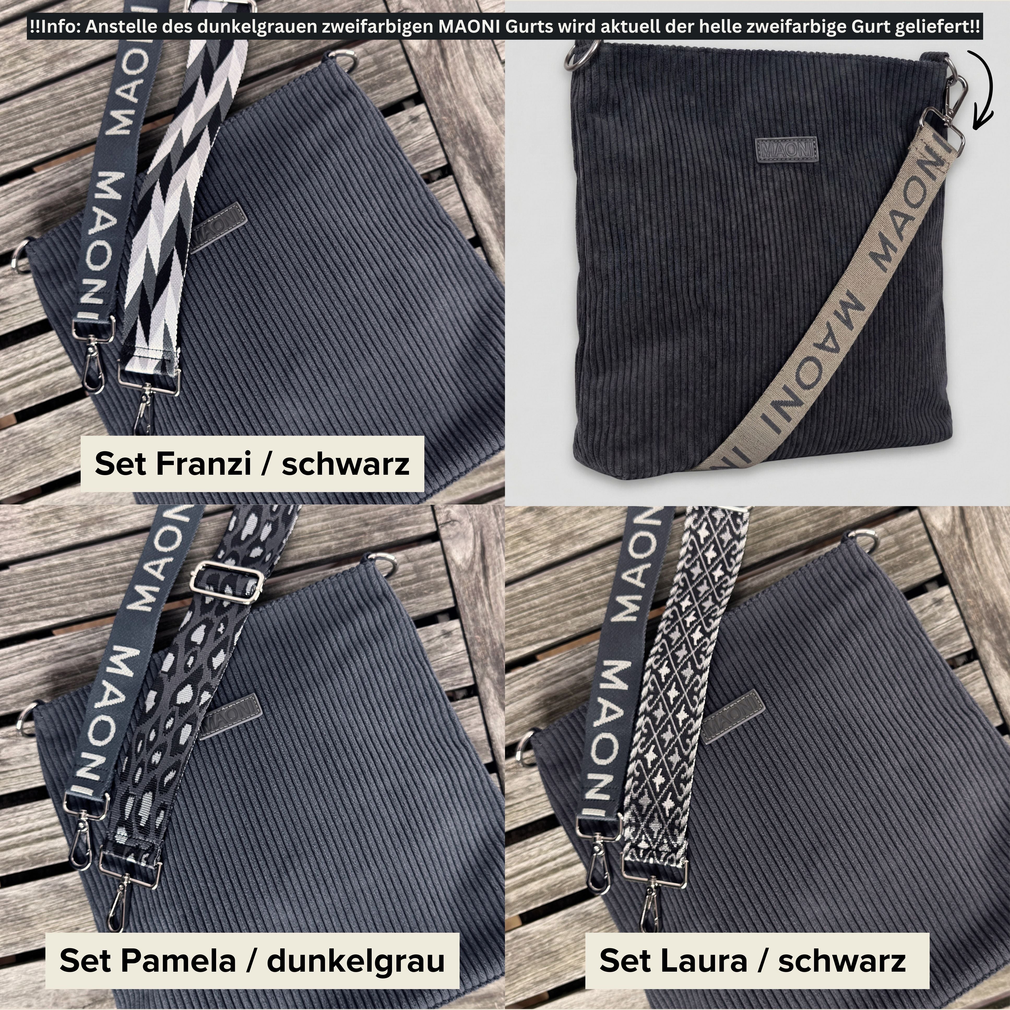 Im Lieferumfang enthalten ist unsere dunkelgraue Cord Umhängetasche inkl. des zweifarbigen MAONI Logo-Gurts und einem weiteren Gurt nach Wahl (Set). Die Gurte lassen sich bis ca. 140 cm verstellen.