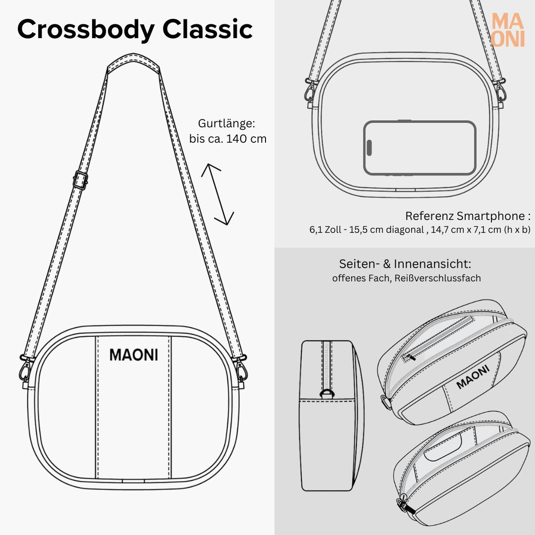 Unsere Umhängetasche Classic ist ungefähr 20cm x 15cm x 6 cm groß. Die Tasche verfügt über je ein innenliegendes Reißverschlussfach und offenes Einsteckfach. Bitte beachte, dass aufgrund der Größe der Tasche kein Smartphone in die separaten Fächer passt. Dein Smartphone findet im Hauptfach seinen Platz.