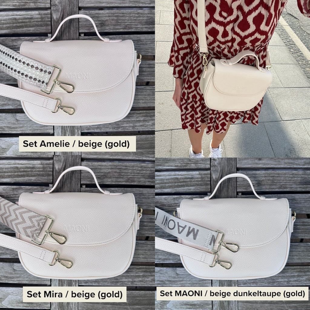 Im Lieferumfang enthalten ist eine beige Halfmoon-Tasche inklusive schmalem Taschengurt in Taschenfarbe und einem breiten Taschengurt nach Wahl.