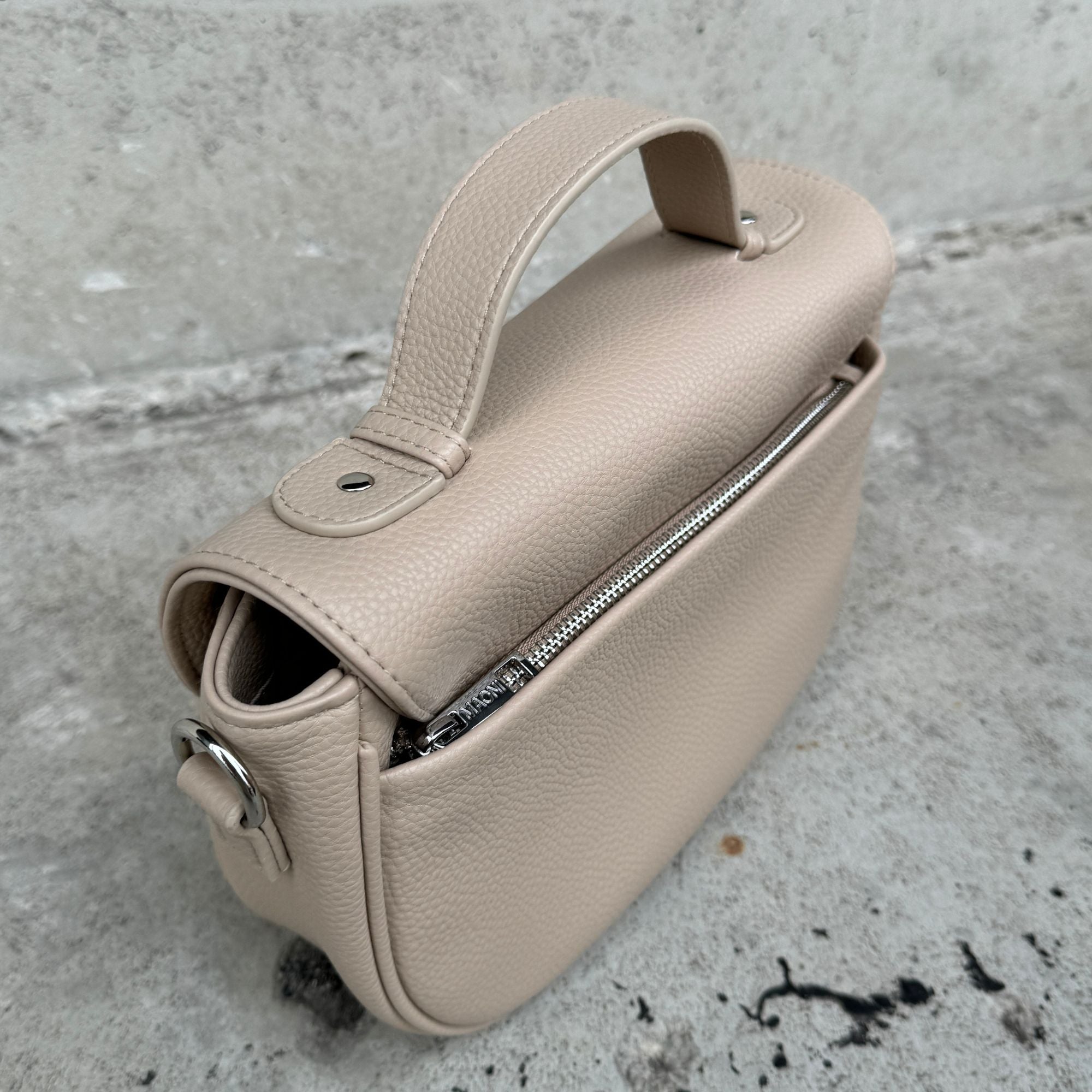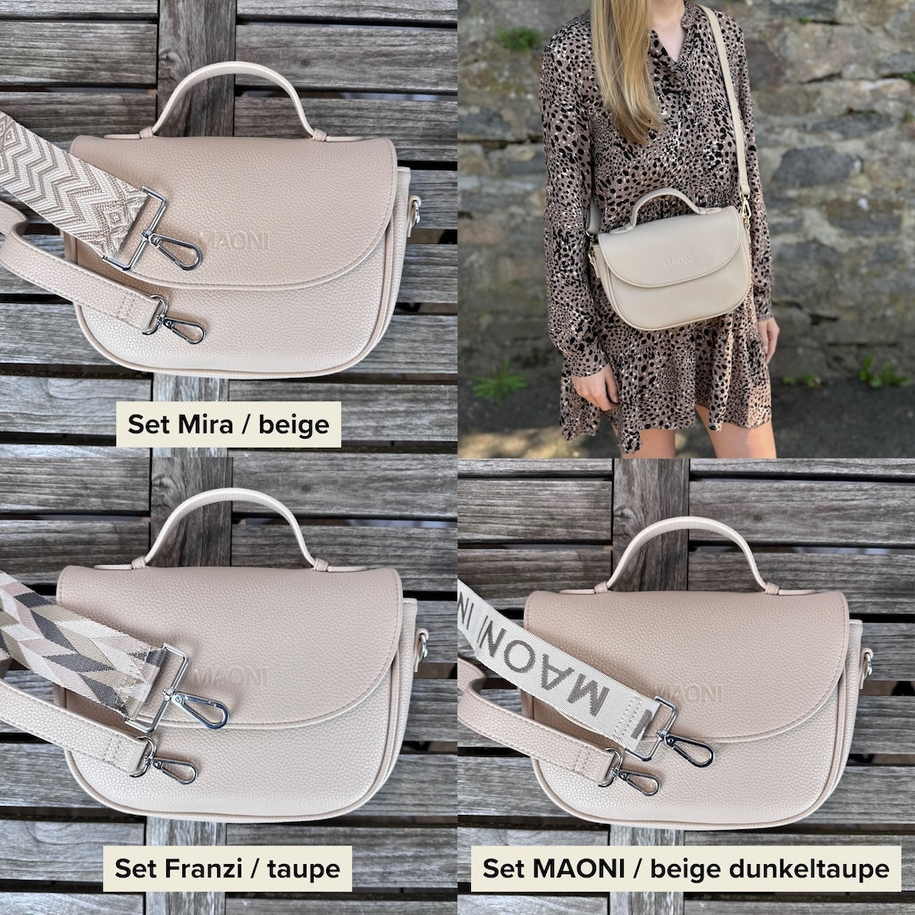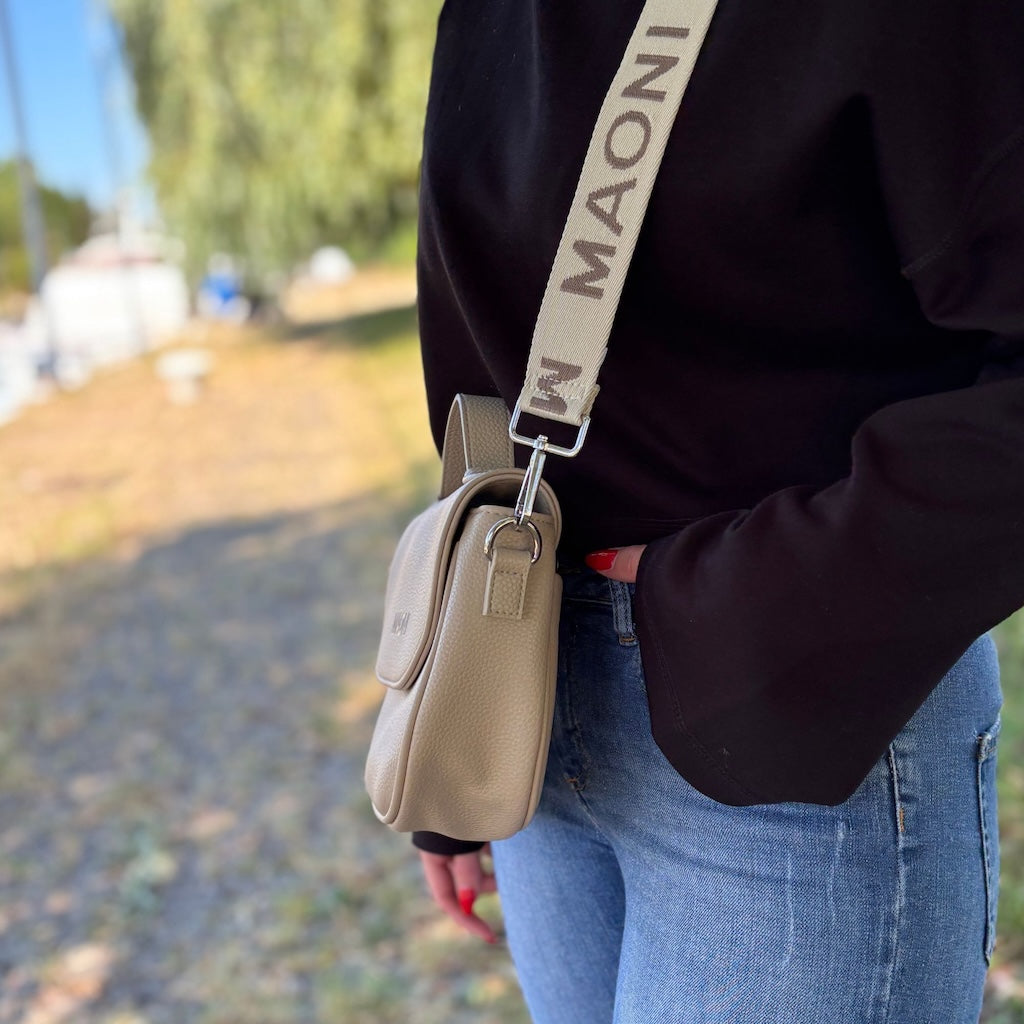 Im Lieferumfang enthalten ist eine taupefarbene Halfmoon-Tasche inklusive schmalem Taschengurt in Taschenfarbe und einem breiten Taschengurt nach Wahl.