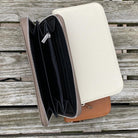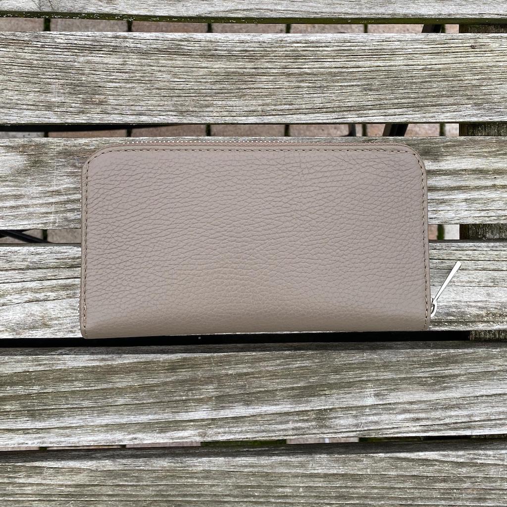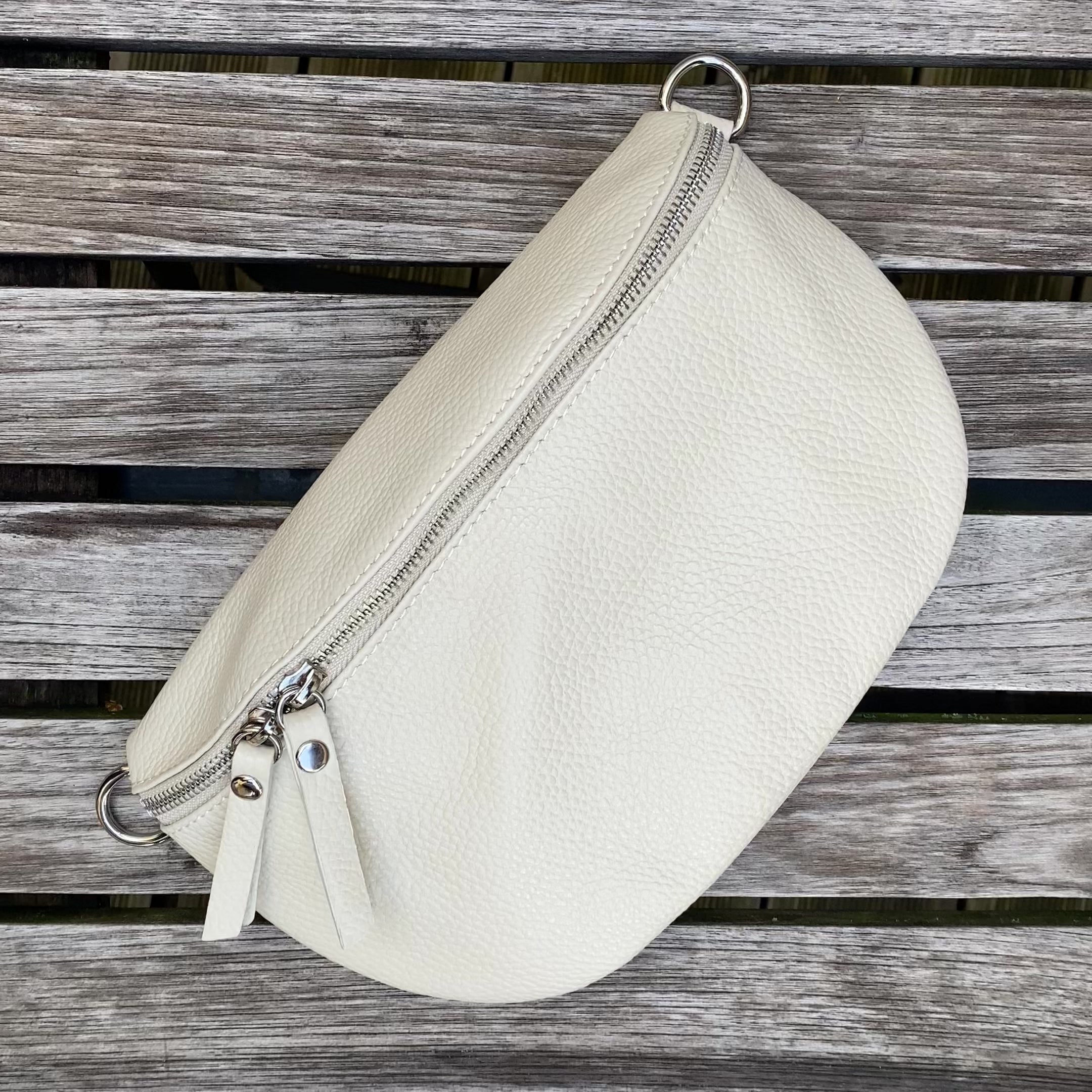 Die Ledergeldbörse ist in Italien gefertigt. Im Produktvideo ist die mittelgroße Bauchtasche in der Farbe beige zu sehen.