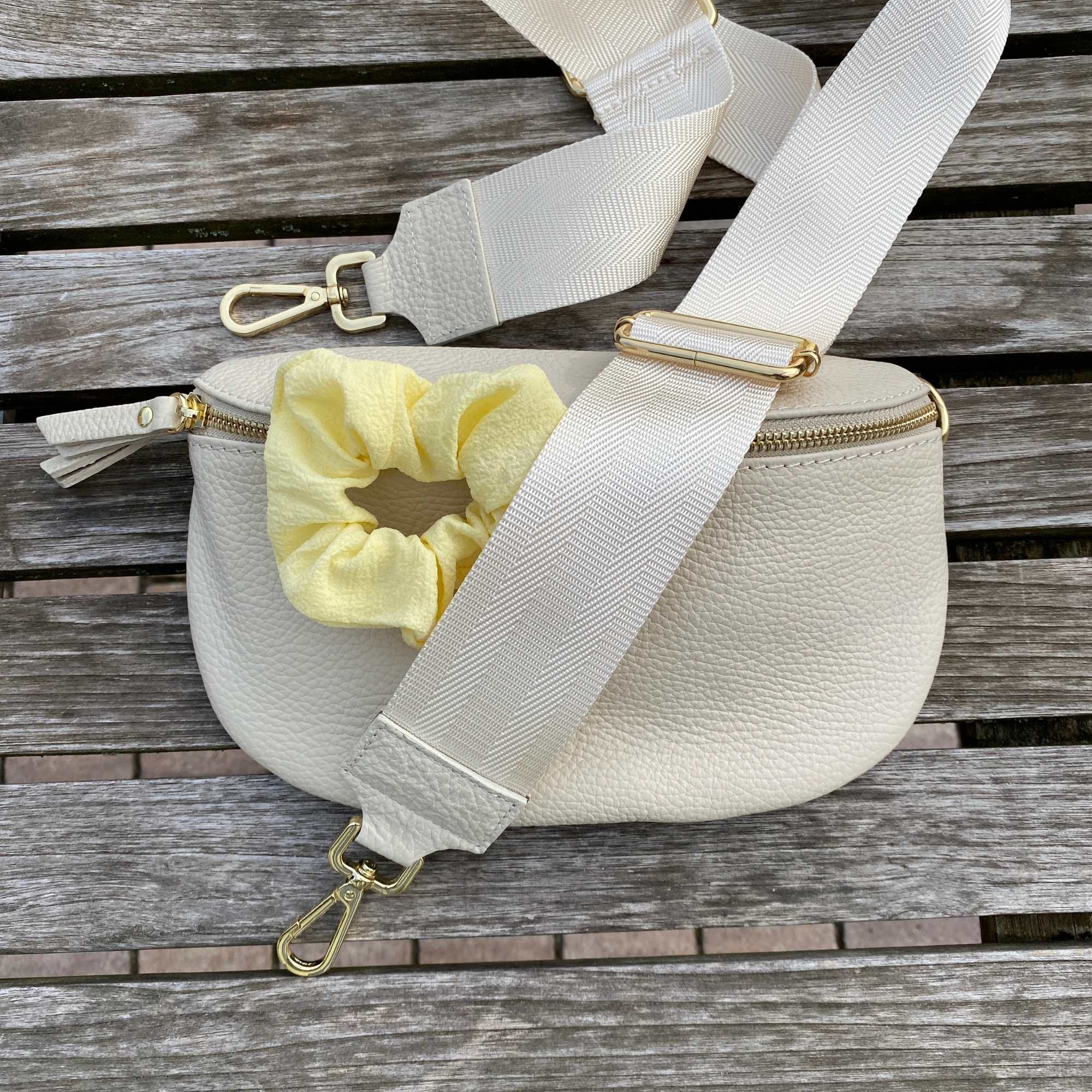 gelber Scrunchie: mittelgroße Bauchtasche in beige mit goldenem Verschluss