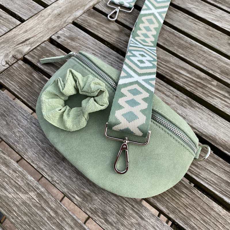 grüner Scrunchie: kleine Bauchtasche in grün mit goldenem Verschluss