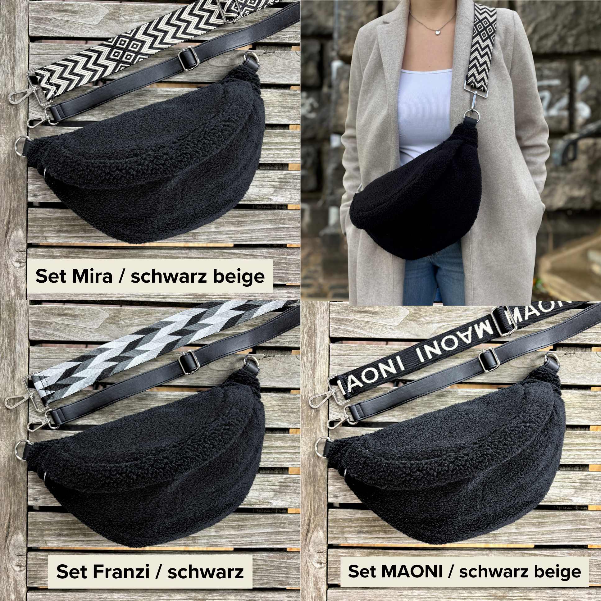 Im Lieferumfang enthalten ist unsere schwarze Teddy Tasche mit einem einfarbigen Taschengurt und einem breiten Stoffgurt nach Wahl. Die Hardware der Tasche ist silberfarben.