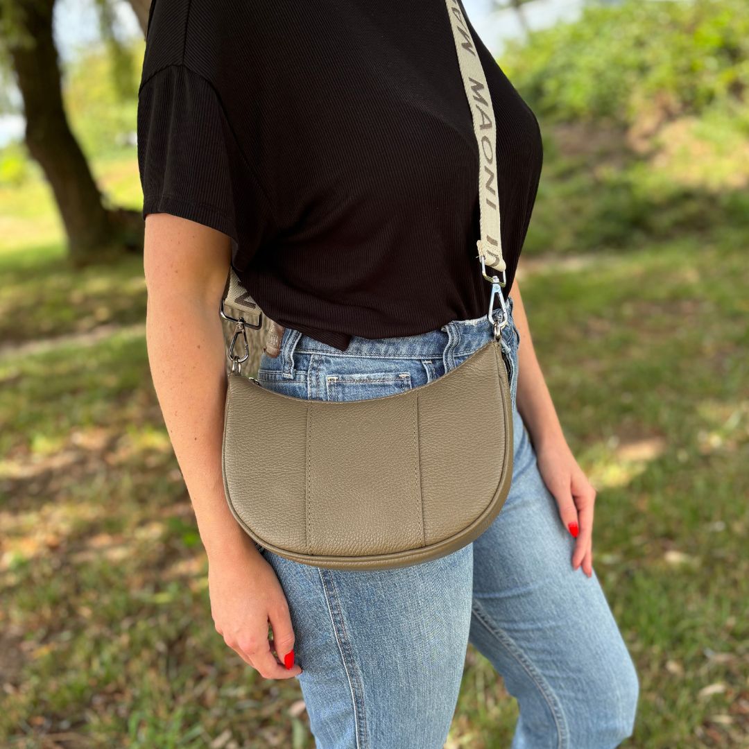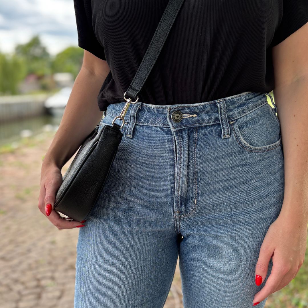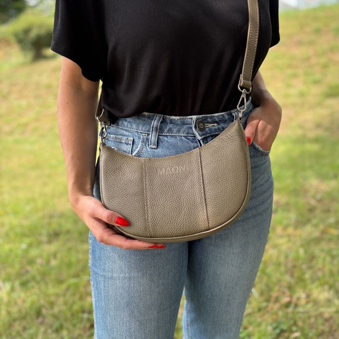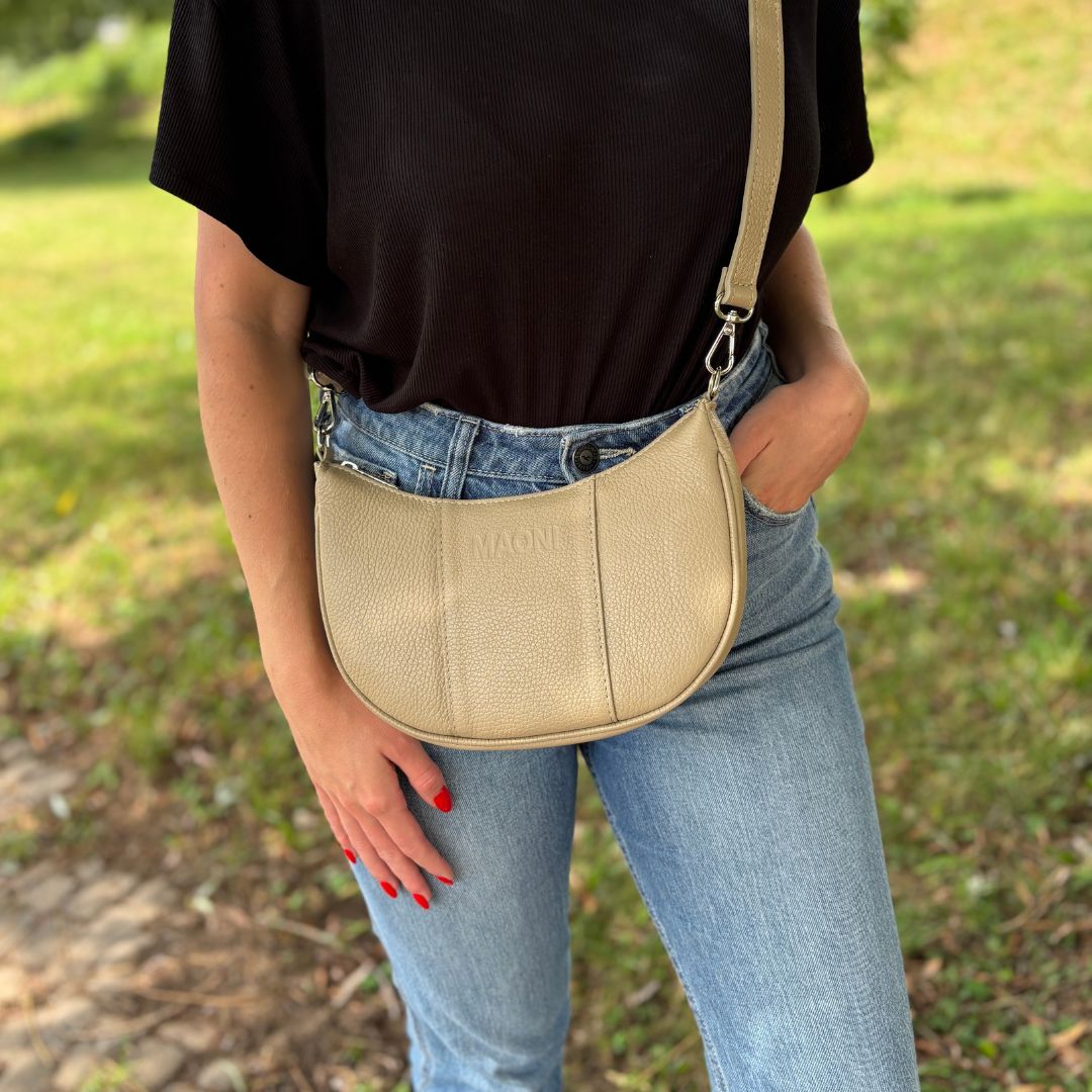 Im Lieferumfang enthalten ist unsere kleine Crossbody Tasche Moon aus Leder und ein schmaler Ledergurt mit silbernem Verschluss.
