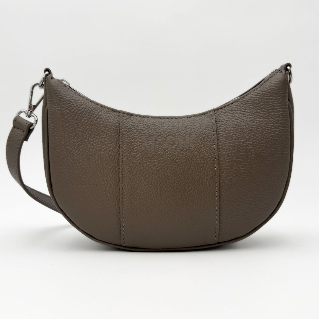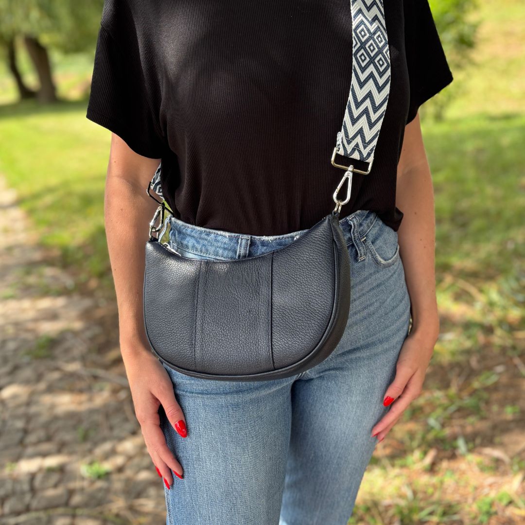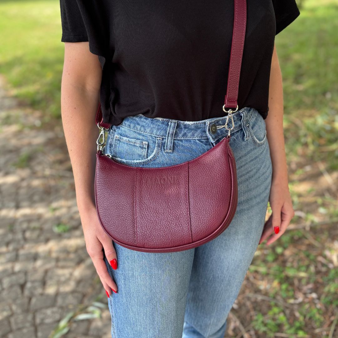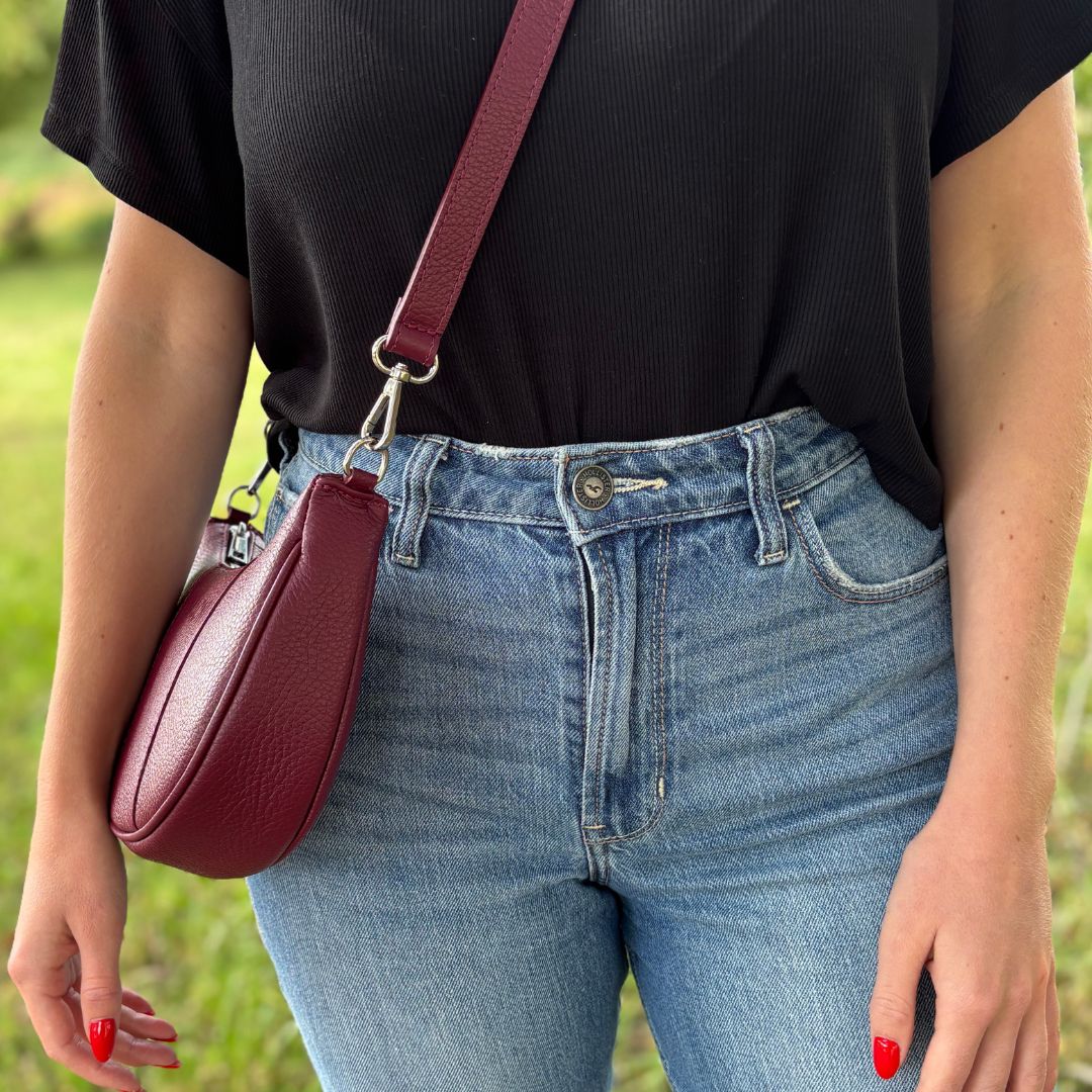 Im Lieferumfang enthalten ist unsere kleine Crossbody Tasche Moon aus Leder und ein schmaler Ledergurt mit silbernem Verschluss.