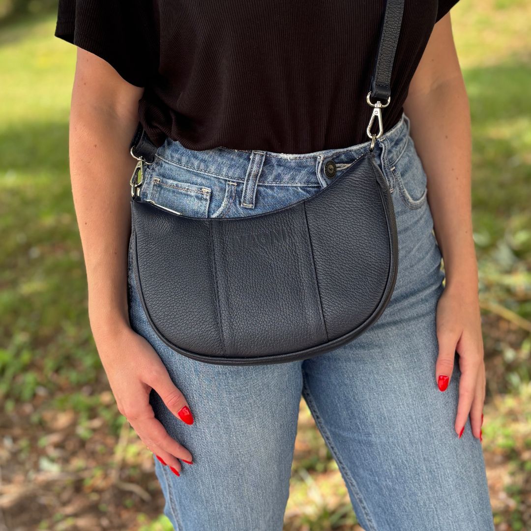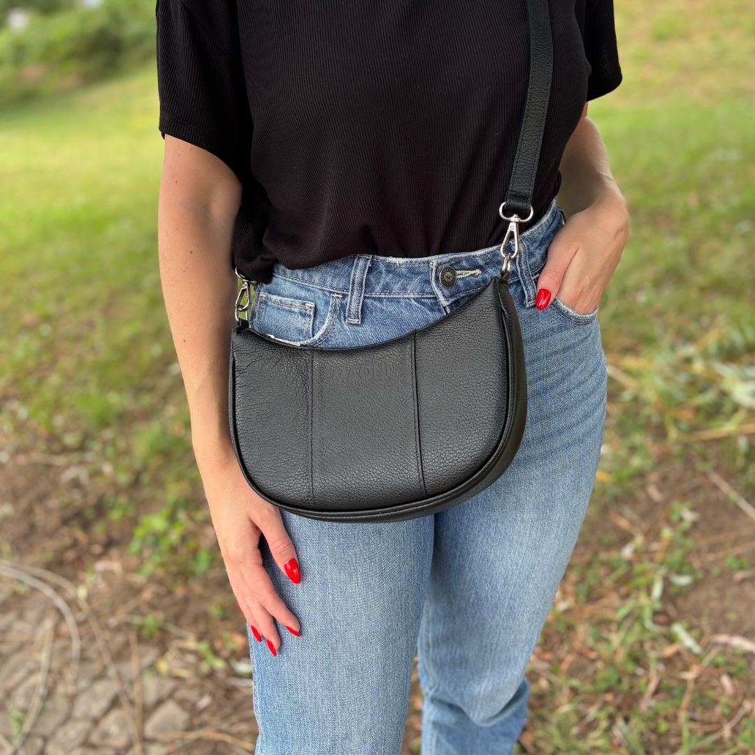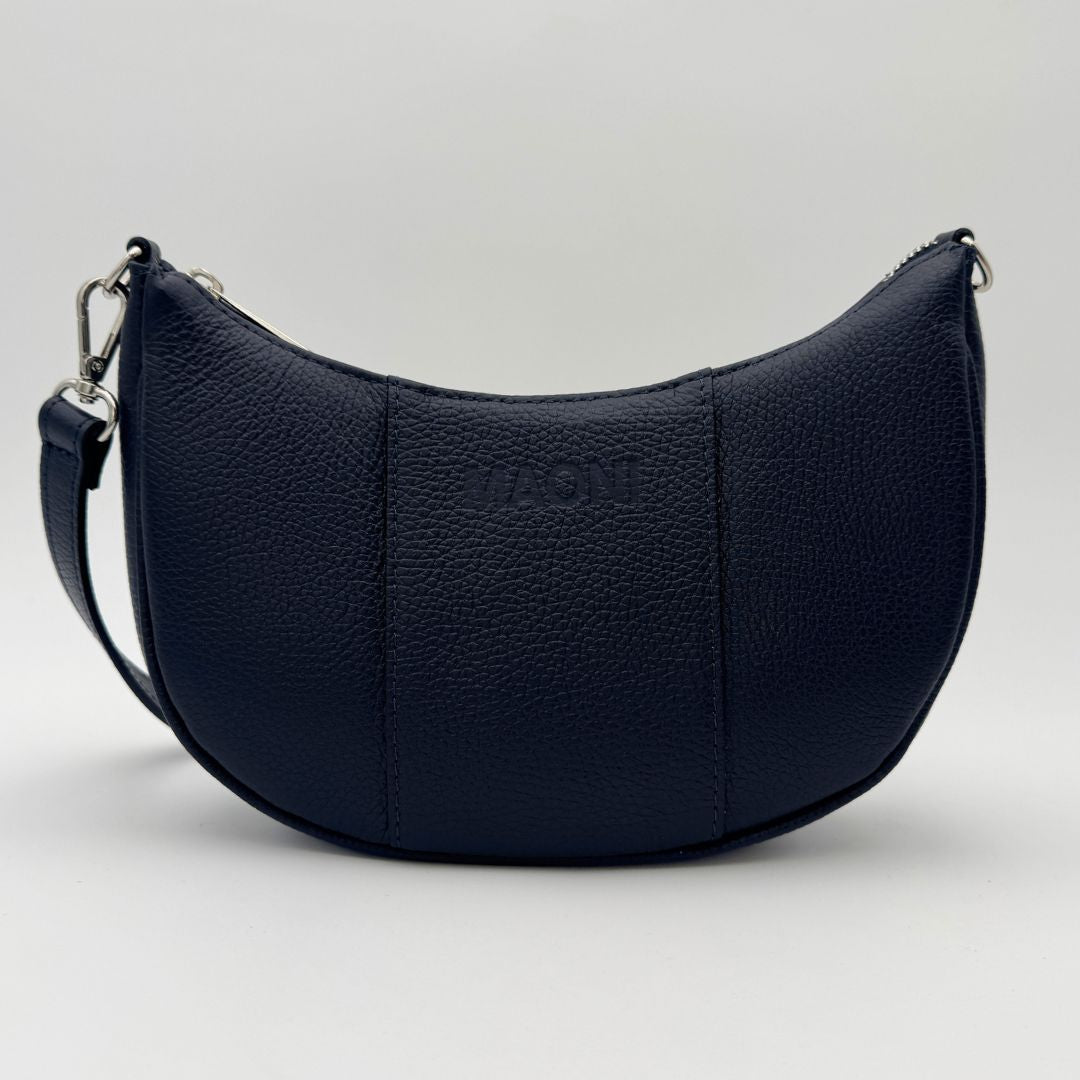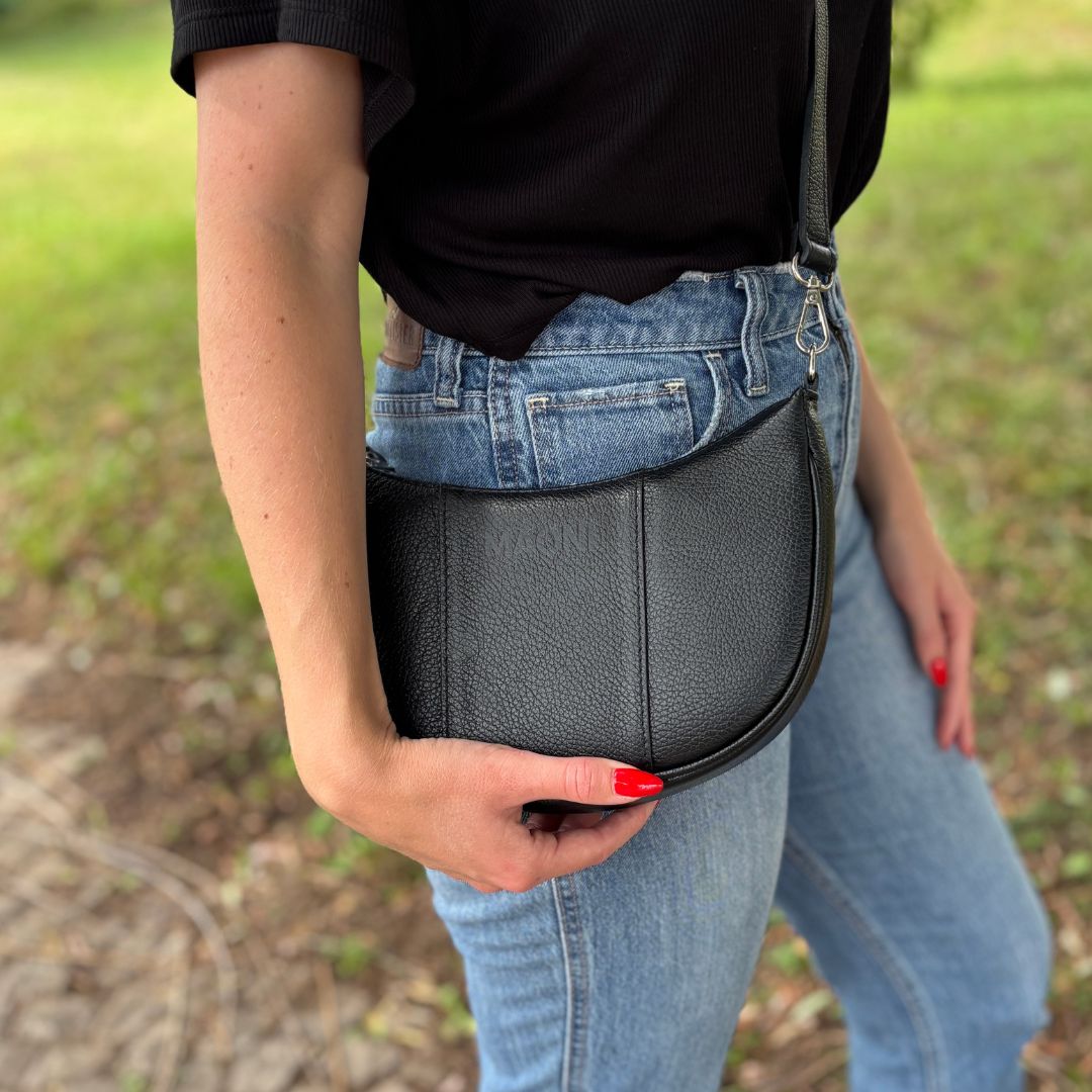Im Lieferumfang enthalten ist unsere kleine Crossbody Tasche Moon aus Leder und ein schmaler Ledergurt mit silbernem Verschluss.