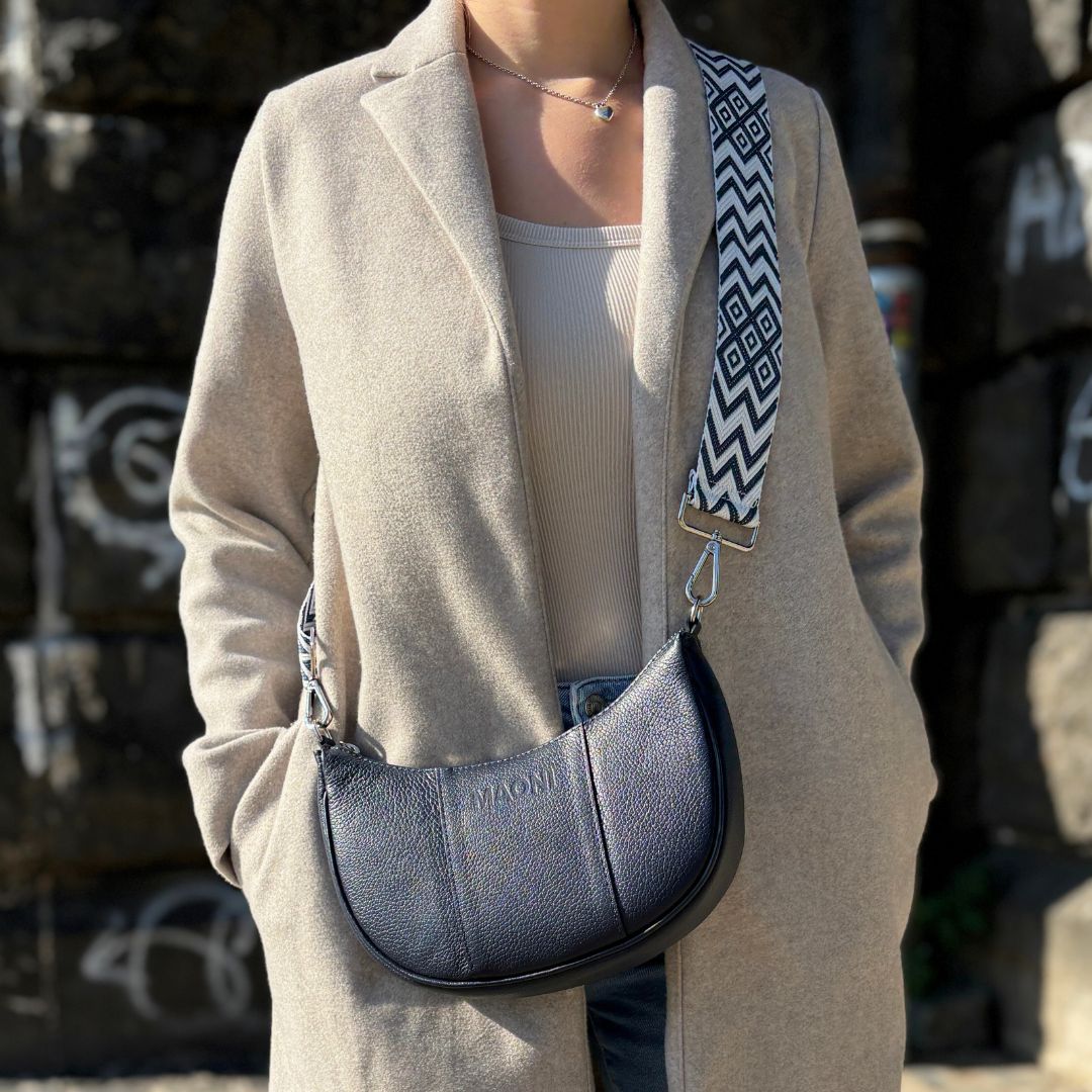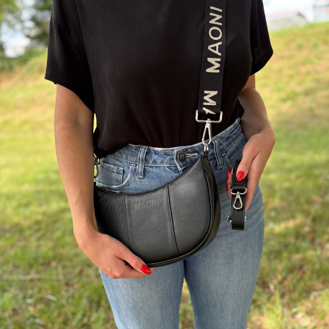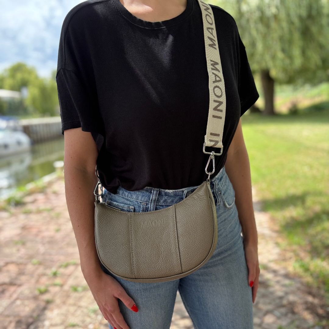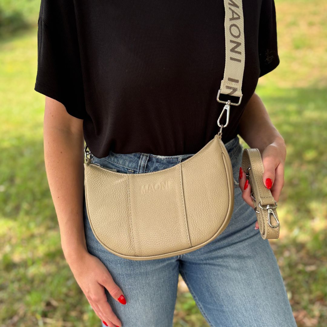 Optional: Im Set MAONI erhältst du - zusätzlich zum schmalen Ledergurt - einen breiten Taschengurt im MAONI Design.