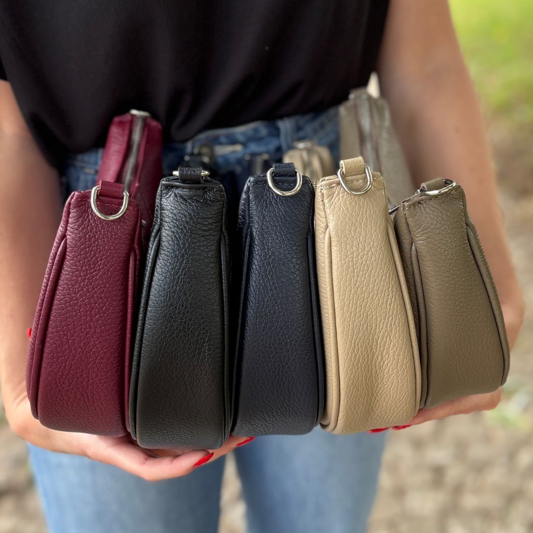 Umhängetasche + schmaler Taschengurt aus Echtleder mit silberfarbener Hardware.